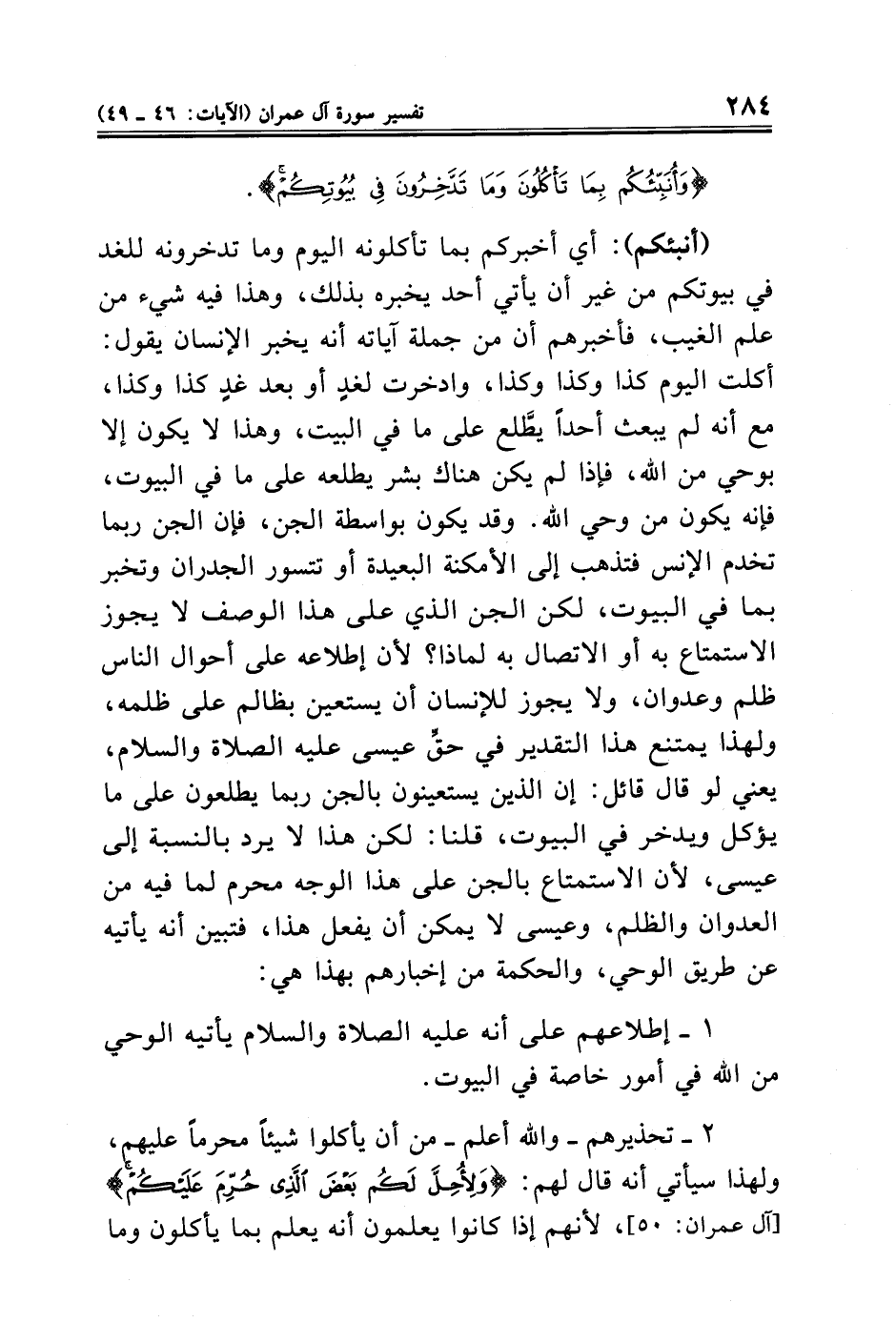 (أنبئكم): أي أخبركم بما تأكلونه اليوم وما تدخرونه للغد في بيوتكم من غير أن يأتي أحد يخبره بذلك، وهذا فيه شيء من علم الغيب، فأخبرهم أن من جملة آياته أنه يخبر الإنسان يقول: أكلت اليوم كذا وكذا وكذا، وادخرت لغدٍ أو بعد غدٍ كذا وكذا، مع أنه لم يبعث أحدًا يطَّلع على ما في البيت، وهذا لا يكون إلا بوحي من الله، فإذا لم يكن هناك بشر يطلعه على ما في البيوت، فإنه يكون من وحي الله. وقد يكون بواسطة الجن، فإن الجن ربما تخدم الإنس فتذهب إلى الأمكنة البعيدة أو تتسور الجدران وتخبر بما في البيوت، لكن الجن الذي على هذا الوصف لا يجوز الاستمتاع به أو الاتصال به لماذا؟ لأن إطلاعه على أحوال الناس ظلم وعدوان، ولا يجوز للإنسان أن يستعين بظالم على ظلمه، ولهذا يمتنع هذا التقدير في حقِّ عيسى عليه الصلاة والسلام، يعني لو قال قائل: إن الذين يستعينون بالجن ربما يطلعون على ما يؤكل ويدخر في البيوت، قلنا: لكن هذا لا يرد بالنسبة إلى عيسى، لأن الاستمتاع بالجن على هذا الوجه محرم لما فيه من العدوان والظلم، وعيسى لا يمكن أن يفعل هذا، فتبين أنه يأتيه عن طريق الوحي، والحكمة من إخبارهم بهذا هي: