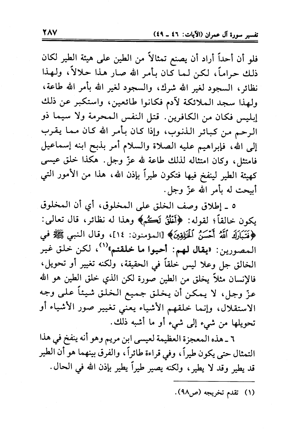 فلو أن أحدًا أراد أن يصنع تمثالًا من الطين على هيئة الطير لكان ذلك حرامًا، لكن لما كان بأمر الله صار هذا حلالًا، ولهذا نظائر، السجود لغير الله شرك، والسجود لغير الله بأمر الله طاعة، ولهذا سجد الملائكة لآدم فكانوا طائعين، واستكبر عن ذلك إبليس فكان من الكافرين. قتل النفس المحرمة ولاسيما ذو الرحم من كبائر الذنوب، وإذا كان بأمر الله كان مما يقرب إلى الله، فإبراهيم عليه الصلاة والسلام أمر بذبح ابنه إسماعيل فامتثل، وكان امتثاله لذلك طاعة لله عزّ وجل. هكذا خلق عيسى كهيئة الطير لينفخ فيها فتكون طيرًا بإذن الله، هذا من الأمور التي أبيحت له بأمر الله عزّ وجل.