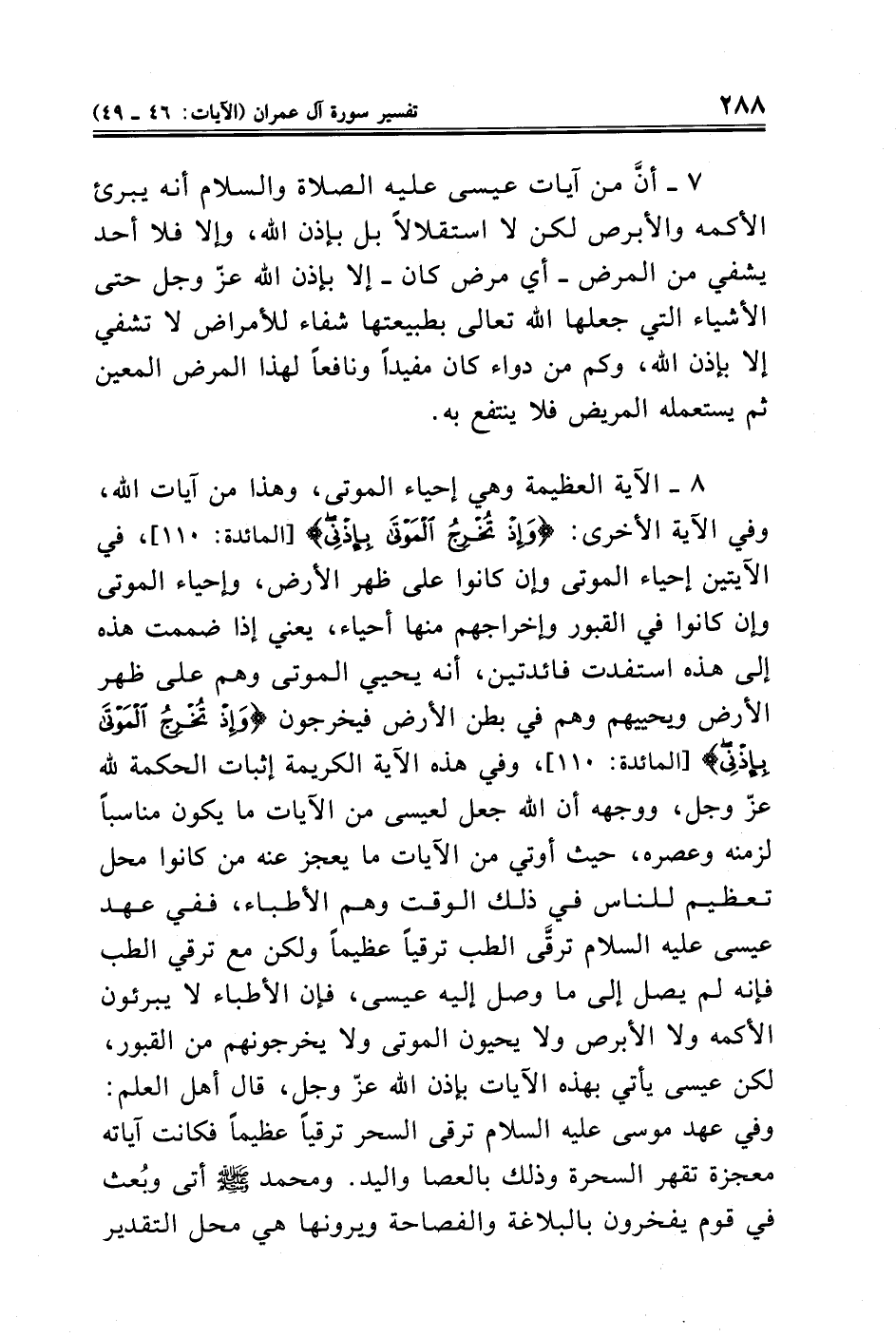 ٨ - الآية العظيمة وهي إحياء الموتى، وهذا من آيات الله، وفي الآية الأخرى: {وَإِذْ تُخْرِجُ الْمَوْتَى بِإِذْنِي} [المائدة: ١١٠]، في الآيتين إحياء الموتى وإن كانوا على ظهر الأرض، وإحياء الموتى وإن كانوا في القبور وإخراجهم منها أحياء، يعني إذا ضممت هذه إلى هذه استفدت فائدتين، أنه يحيي الموتى وهم على ظهر الأرض ويحييهم وهم في بطن الأرض فيخرجون {وَإِذْ تُخْرِجُ الْمَوْتَى بِإِذْنِي} [المائدة: ١١٠]، وفي هذه الآية الكريمة إثبات الحكمة لله عزّ وجل، ووجهه أن الله جعل لعيسى من الآيات ما يكون مناسبًا لزمنه وعصره، حيث أوتي من الآيات ما يعجز عنه من كانوا محل تعظيم للناس في ذلك الوقت وهم الأطباء، ففي عهد عيسى عليه السلام ترقَّى الطب ترقيًا عظيمًا ولكن مع ترقي الطب فإنه لم يصل إلى ما وصل إليه عيسى، فإن الأطباء لا يبرئون الأكمه ولا الأبرص ولا يحيون الموتى ولا يخرجونهم من القبور، لكن عيسى يأتي بهذه الآيات بإذن الله عزّ وجل، قال أهل العلم: وفي عهد موسى عليه السلام ترقى السحر ترقيًا عظيمًا فكانت آياته معجزة تقهر السحرة وذلك بالعصا واليد. ومحمد - صلى الله عليه وسلم - أتى وبُعث في قوم يفخرون بالبلاغة والفصاحة ويرونها هي محل التقدير