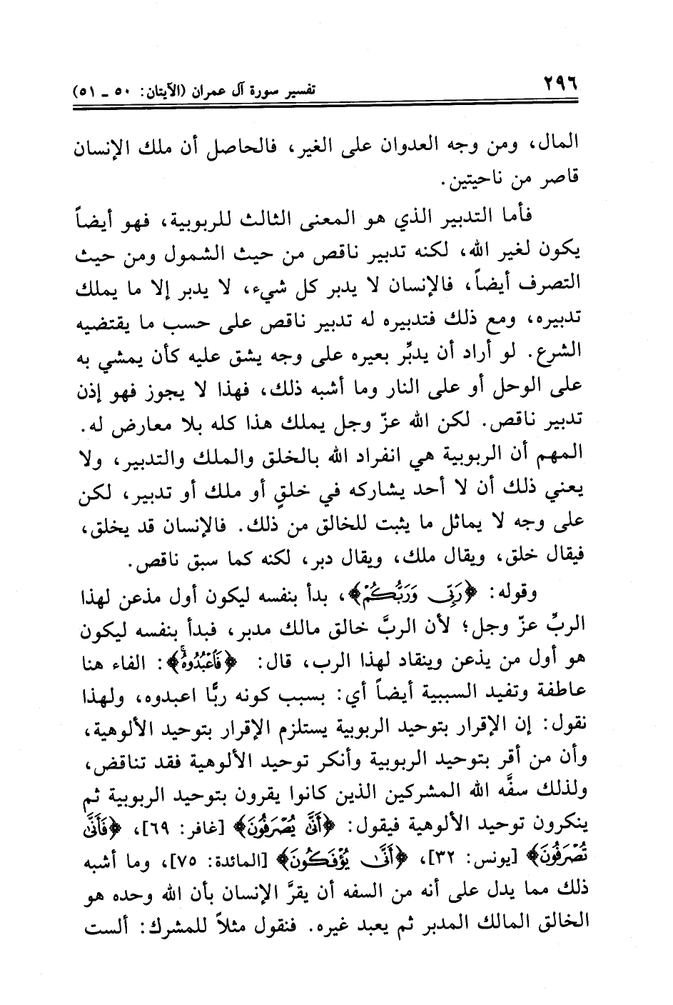 وقوله: {رَبِّي وَرَبُّكُمْ}، بدأ بنفسه ليكون أول مذعن لهذا الربّ عزّ وجل؛ لأن الربَّ خالق مالك مدبر، فبدأ بنفسه ليكون هو أول من يذعن وينقاد لهذا الرب، قال: {فَاعْبُدُوهُ}: الفاء هنا عاطفة وتفيد السببية أيضًا أي: بسبب كونه ربًّا اعبدوه، ولهذا نقول: إن الإقرار بتوحيد الربوبية يستلزم الإقرار بتوحيد الألوهية، وأن من أقر بتوحيد الربوبية وأنكر توحيد الألوهية فقد تناقض، ولذلك سفَّه الله المشركين الذين كانوا يقرون بتوحيد الربوبية ثم ينكرون توحيد الألوهية فيقول: {أَنَّى يُصْرَفُونَ} [غافر: ٦٩]، {فَأَنَّى تُصْرَفُونَ} [يونس: ٣٢]، {أَنَّى يُؤْفَكُونَ} [المائدة: ٧٥]، وما أشبه ذلك مما يدل على أنه من السفه أن يقرَّ الإنسان بأن الله وحده هو الخالق المالك المدبر ثم يعبد غيره. فنقول مثلًا للمشرك: ألست