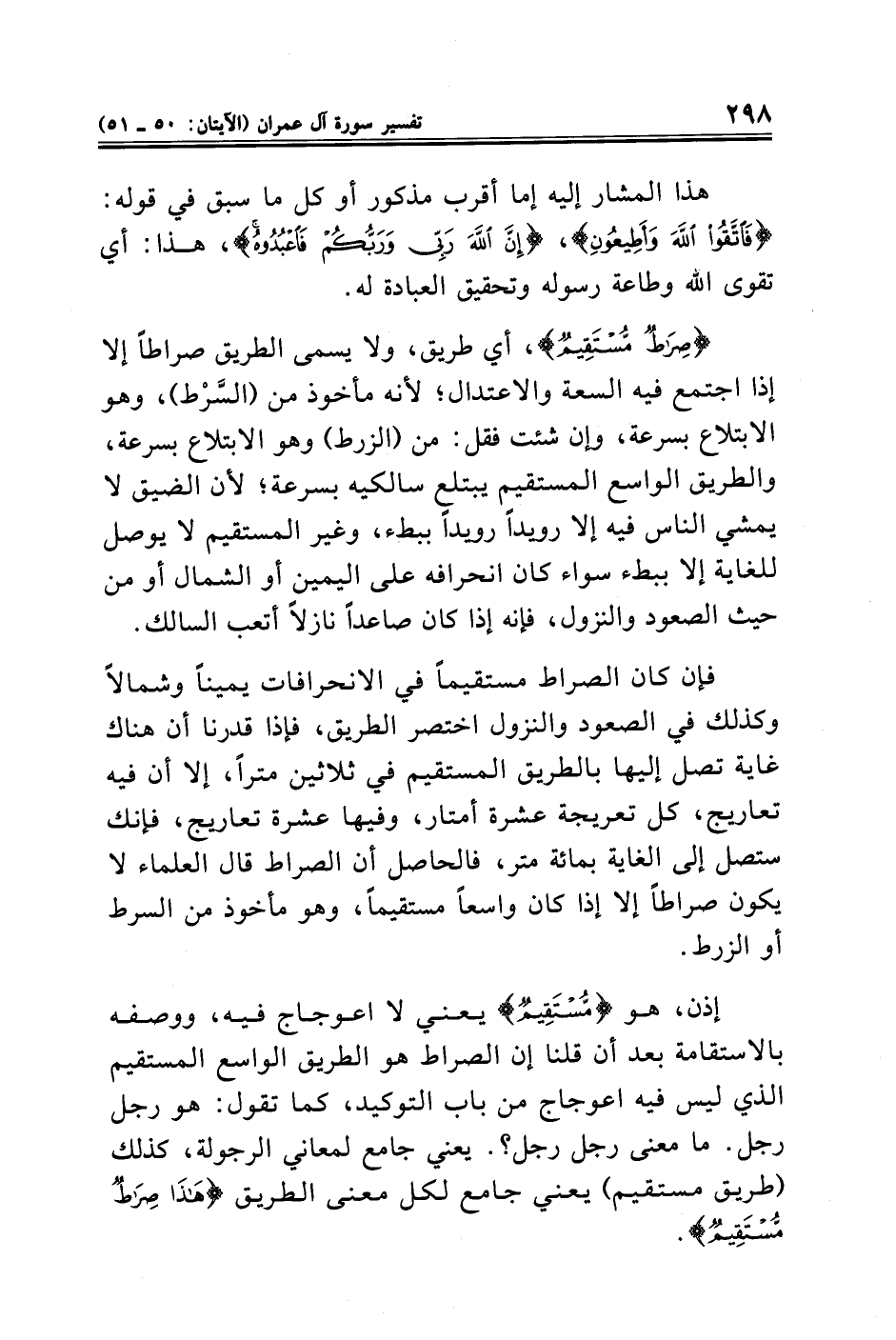 {صِرَاطٌ مُسْتَقِيمٌ}، أي طريق، ولا يسمى الطريق صراطًا إلا إذا اجتمع فيه السعة والاعتدال؛ لأنه مأخوذ من (السَّرْط)، وهو الابتلاع بسرعة، وإن شئت فقل: من (الزرط) وهو الابتلاع بسرعة، والطريق الواسع المستقيم يبتلع سالكيه بسرعة؛ لأن الضيق لا يمشي الناس فيه إلا رويدًا رويدًا ببطء، وغير المستقيم لا يوصل للغاية إلا ببطء سواء كان انحرافه على اليمين أو الشمال أو من حيث الصعود والنزول، فإنه إذا كان صاعدًا نازلًا أتعب السالك.