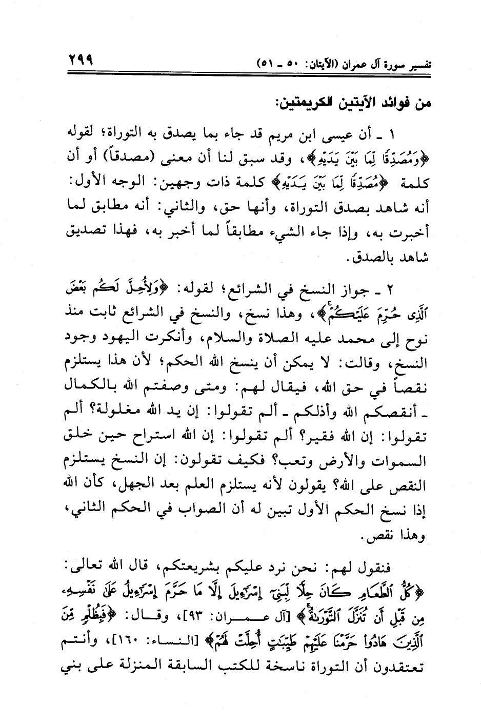 ٢ - جواز النسخ في الشرائع؛ لقوله: {وَلِأُحِلَّ لَكُمْ بَعْضَ الَّذِي حُرِّمَ عَلَيْكُمْ}، وهذا نسخ، والنسخ في الشرائع ثابت منذ نوح إلى محمد عليه الصلاة والسلام، وأنكرت اليهود وجود النسخ، وقالت: لا يمكن أن ينسخ الله الحكم؛ لأن هذا يستلزم نقصًا في حق الله، فيقال لهم: ومتى وصفتم الله بالكمال -أنقصكم الله وأذلكم- ألم تقولوا: إن يد الله مغلولة؟ ألم تقولوا: إن الله فقير؟ ألم تقولوا: إن الله استراح حين خلق السموات والأرض وتعب؟ فكيف تقولون: إن النسخ يستلزم النقص على الله؟ يقولون لأنه يستلزم العلم بعد الجهل، كأن الله إذا نسخ الحكم الأول تبين له أن الصواب في الحكم الثاني، وهذا نقص.