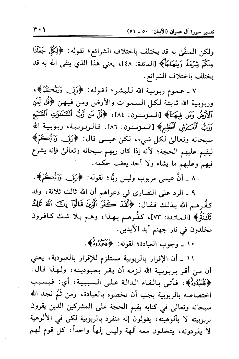 ٧ - عموم ربوبية الله للبشر؛ لقوله: {رَبِّي وَرَبِّكُمْ}، وربوبية الله ثابتة لكل السموات الأرض ومن فيهن {قُلْ لِمَنِ الْأَرْضُ وَمَنْ فِيهَا} [المؤمنون: ٨٤]، {قُلْ مَنْ رَبُّ السَّمَاوَاتِ السَّبْعِ وَرَبُّ الْعَرْشِ الْعَظِيمِ} [المؤمنون: ٨٦]. فالربوبية، ربوبية الله سبحانه وتعالى لكل شيء، لكن عيسى قال: {رَبِّي وَرَبَّكُمْ} ليقيم عليهم الحجة؛ لأنه إذا كان ربهم سبحانه وتعالى فإنه يشرع فيهم وعليهم ما يشاء ولا أحد يعقب حكمه.