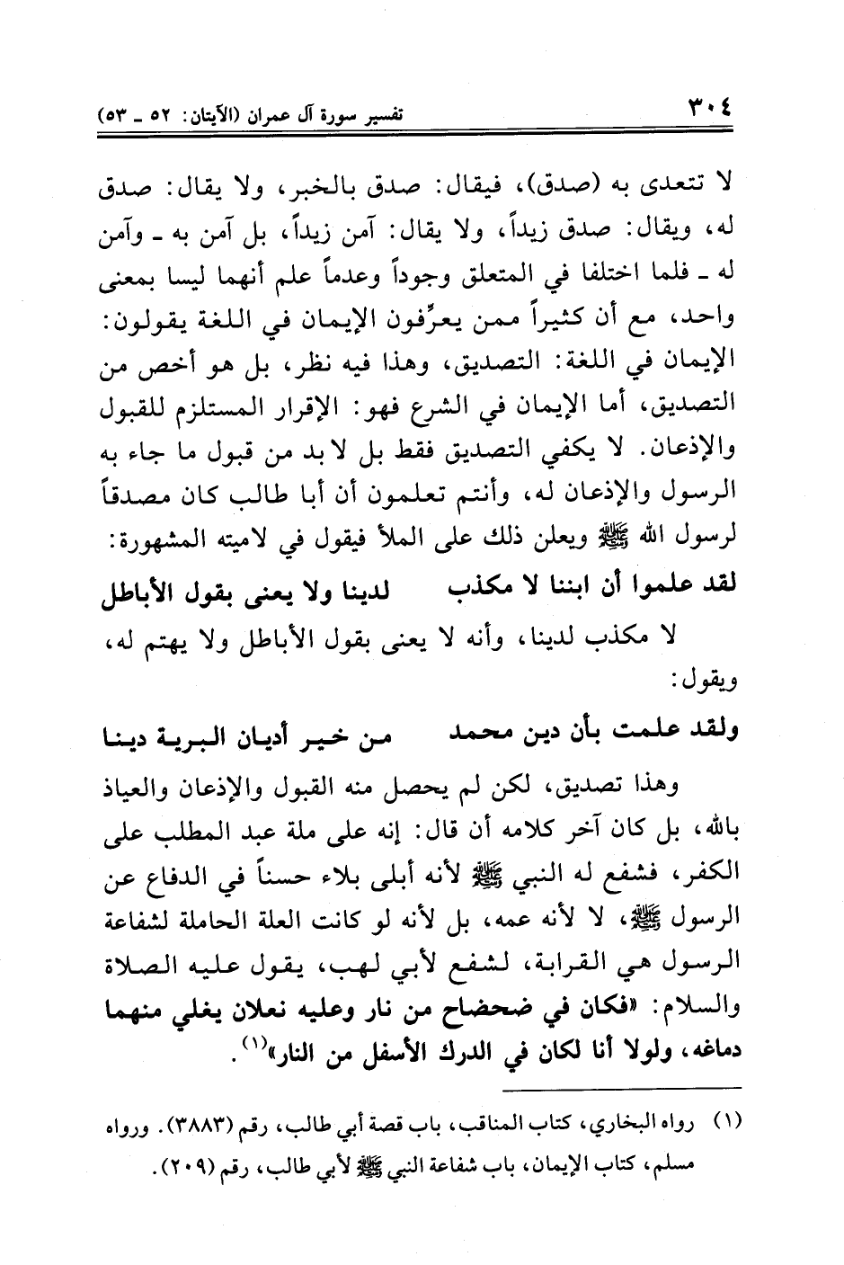 وهذا تصديق، لكن لم يحصل منه القبول والإذعان والعياذ بالله، بل كان آخر كلامه أن قال: إنه على ملة عبد المطلب على الكفر، فشفع له النبي - صلى الله عليه وسلم - لأنه أبلى بلاء حسنًا في الدفاع عن الرسول - صلى الله عليه وسلم -، لا لأنه عمه، بل لأنه لو كانت العلة الحاملة لشفاعة الرسول هي القرابة، لشفع لأبي لهب، يقول عليه الصلاة والسلام: "فكان في ضحضاح من نار وعليه نعلان يغلي منهما دماغه، ولولا أنا لكان في الدرك الأسفل من النار" (¬١).