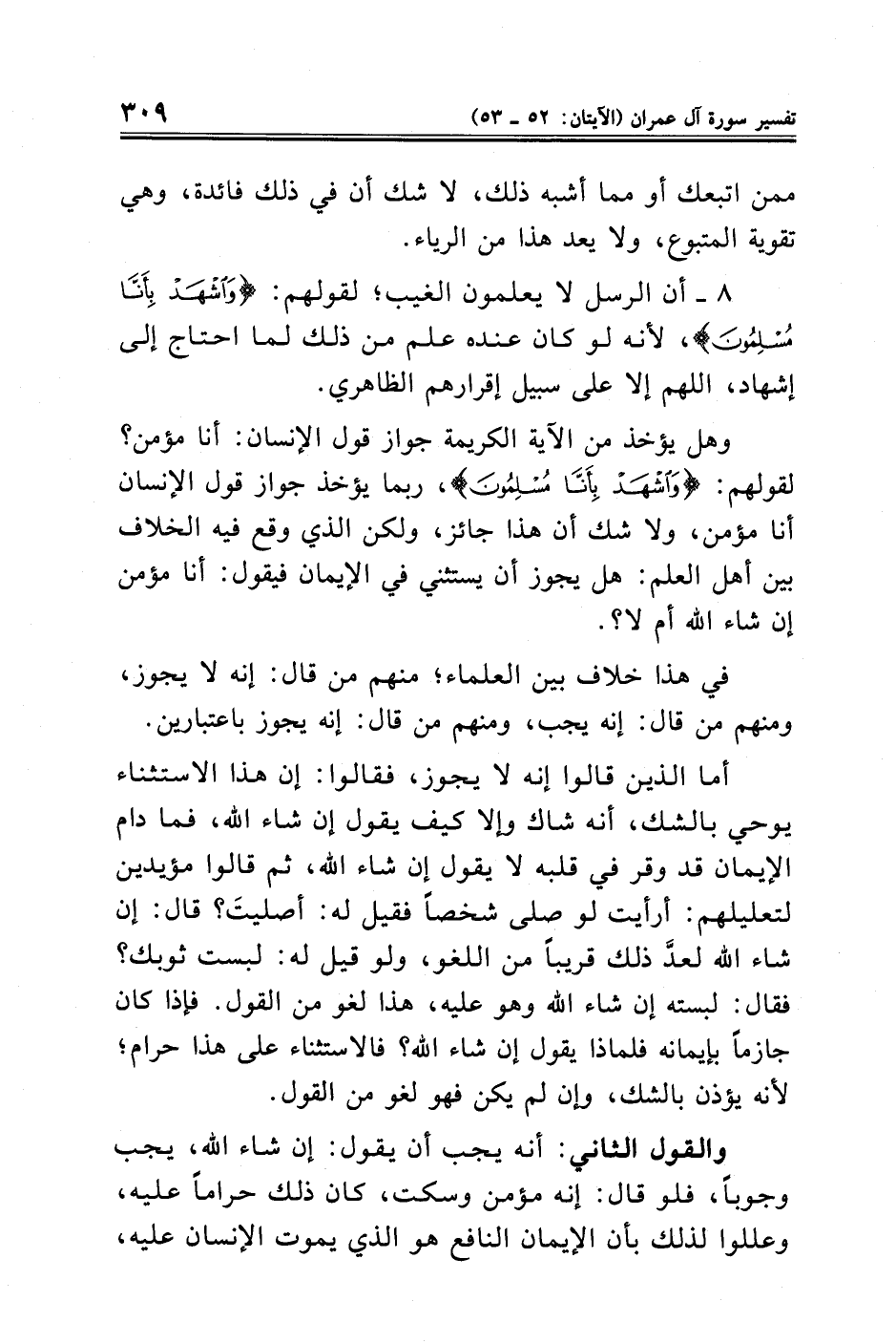 وهل يؤخذ من الآية الكريمة جواز قول الإنسان: أنا مؤمن؟ لقولهم: {وَاشْهَدْ بِأَنَّا مُسْلِمُونَ}، ربما يؤخذ جواز قول الإنسان أنا مؤمن، ولا شك أن هذا جائز، ولكن الذي وقع فيه الخلاف بين أهل العلم: هل يجوز أن يستثني في الإيمان فيقول: أنا مؤمن إن شاء الله أم لا؟ .