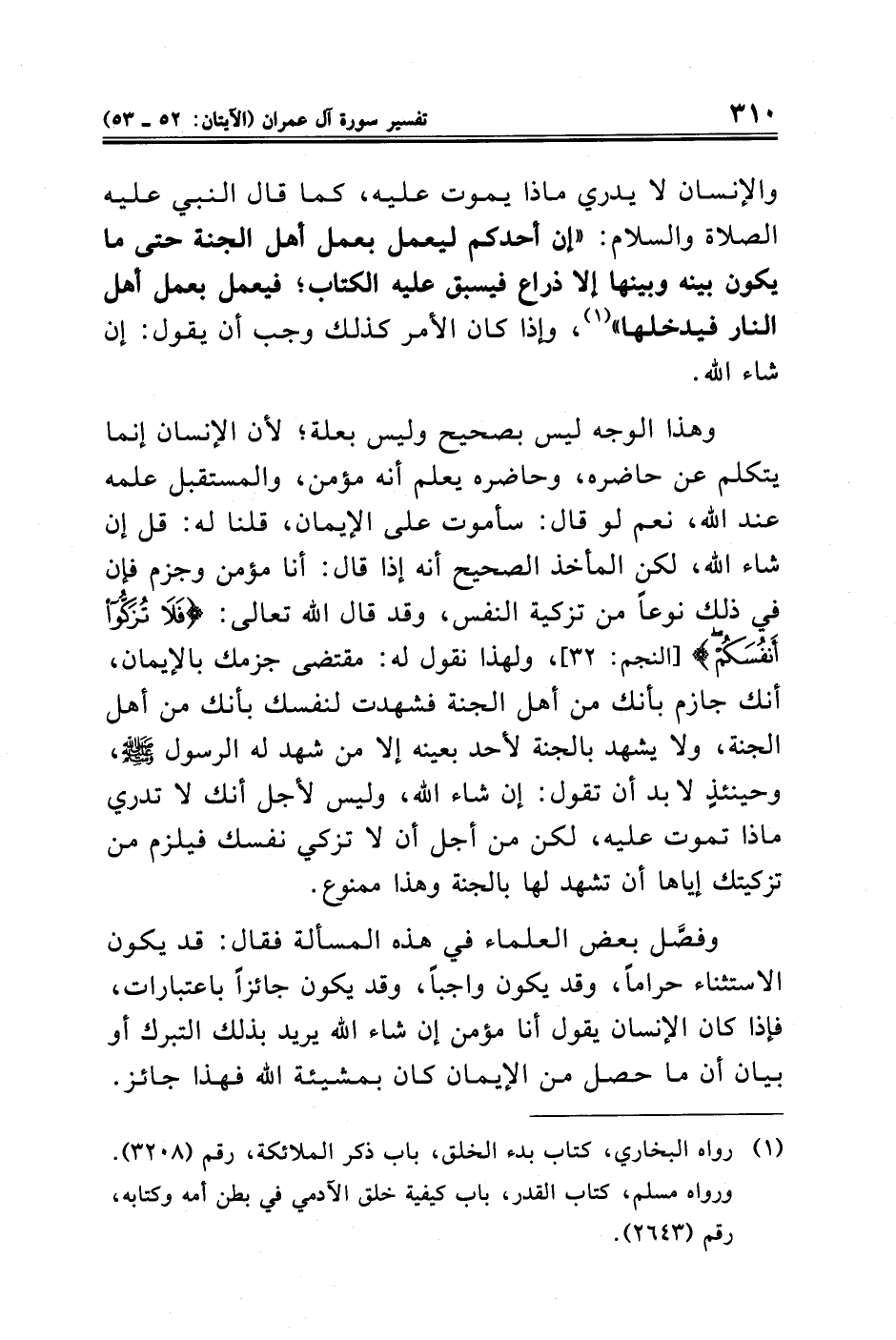 وهذا الوجه ليس بصحيح وليس بعلة؛ لأن الإنسان إنما يتكلم عن حاضره، وحاضره يعلم أنه مؤمن، والمستقبل علمه عند الله، نعم لو قال: سأموت على الإيمان، قلنا له: قل إن شاء الله، لكن المأخذ الصحيح أنه إذا قال: أنا مؤمن وجزم فإن في ذلك نوعًا من تزكية النفس، وقد قال الله تعالى: {فَلَا تُزَكُّوا أَنْفُسَكُمْ} [النجم: ٣٢]، ولهذا نقول له: مقتضى جزمك بالإيمان، أنك جازم بأنك من أهل الجنة فشهدت لنفسك بأنك من أهل الجنة، ولا يشهد بالجنة لأحد بعينه إلا من شهد له الرسول - صلى الله عليه وسلم -، وحينئذٍ لابد أن تقول: إن شاء الله، وليس لأجل أنك لا تدري ماذا تموت عليه، لكن من أجل أن لا تزكي نفسك فيلزم من تزكيتك إياها أن تشهد لها بالجنة وهذا ممنوع.