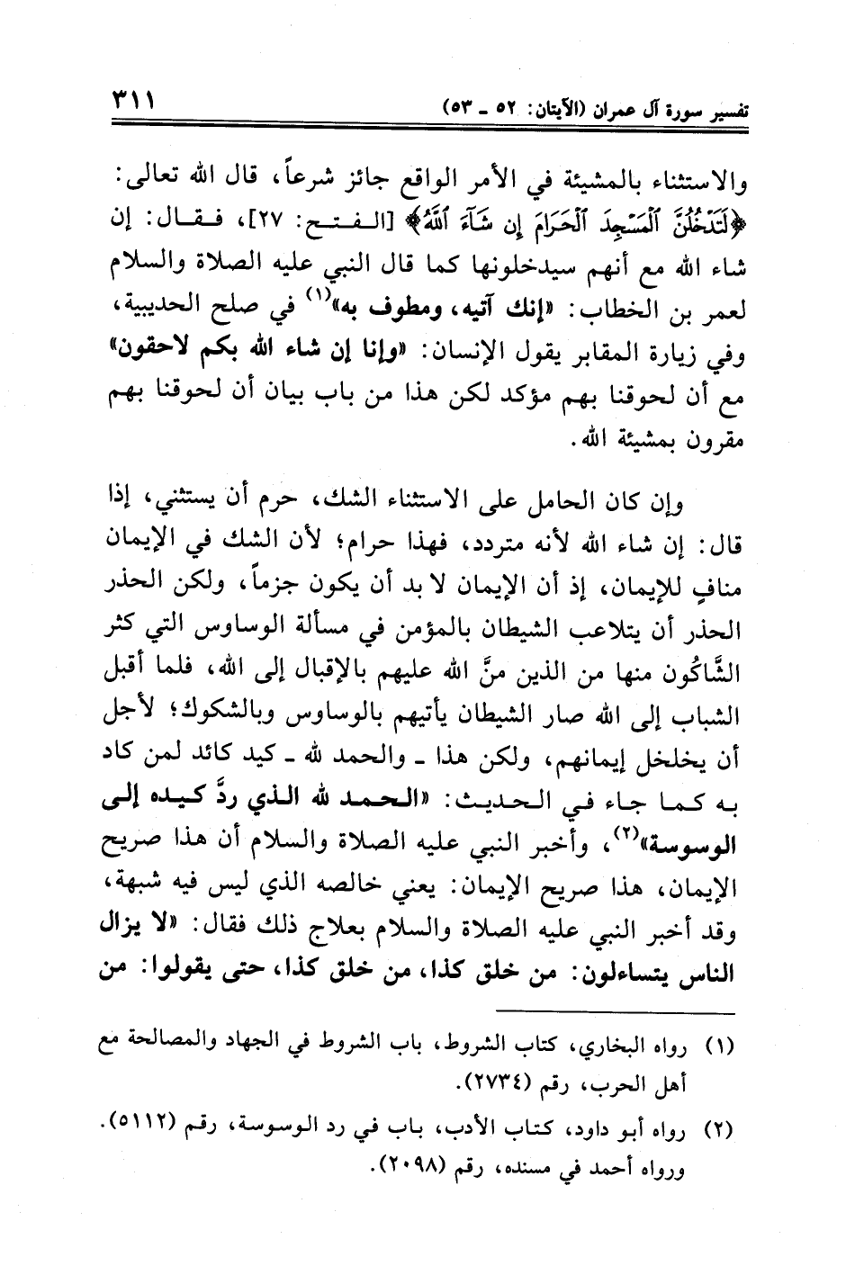 وإن كان الحامل على الاستثناء الشك، حرم أن يستثني، إذا قال: إن شاء الله لأنه متردد، فهذا حرام؛ لأن الشك في الإيمان منافٍ للإيمان، إذ أن الإيمان لابد أن يكون جزمًا، ولكن الحذر الحذر أن يتلاعب الشيطان بالمؤمن في مسألة الوساوس التي كثر الشَّاكُون منها من الذين منَّ الله عليهم بالإقبال إلى الله، فلما أقبل الشباب إلى الله صار الشيطان يأتيهم بالوساوس وبالشكوك؛ لأجل أن يخلخل إيمانهم، ولكن هذا -والحمد لله- كيد كائد لمن كاد به كما جاء في الحديث: "الحمد لله الذي ردَّ كيده إلى الوسوسة" (¬٢)، وأخبر النبي عليه الصلاة والسلام أن هذا صريح الإيمان، هذا صريح الإيمان: يعني خالصه الذي ليس فيه شبهة، وقد أخبر النبي عليه الصلاة والسلام بعلاج ذلك فقال: "لا يزال الناس يتساءلون: من خلق كذا، من خلق كذا، حتى يقولوا: من