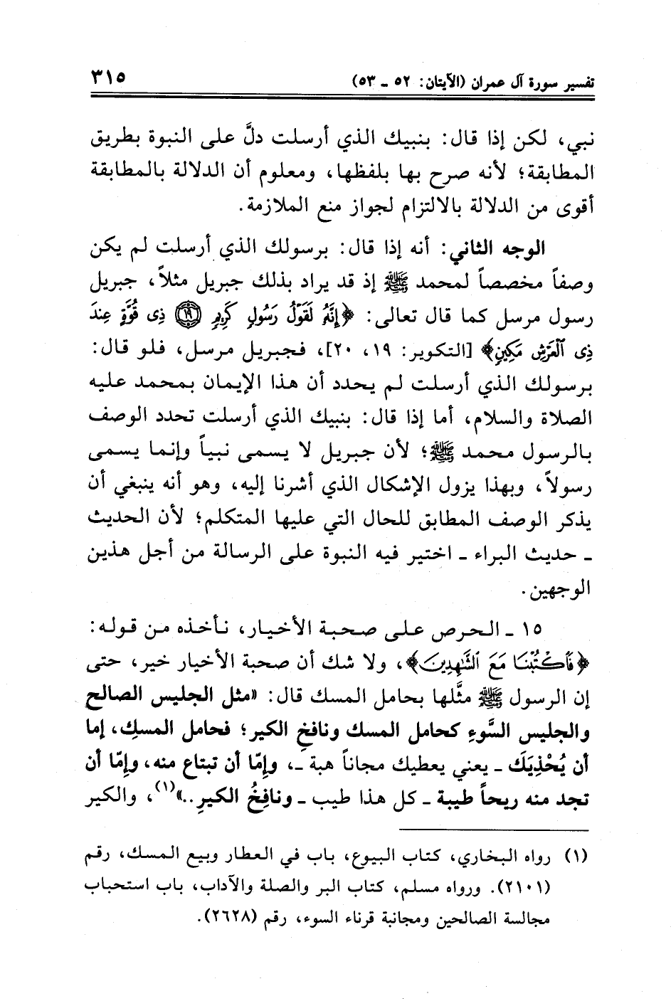 ١٥ - الحرص على صحبة الأخيار، نأخذه من قوله: {فَاكْتُبْنَا مَعَ الشَّاهِدِينَ}، ولا شك أن صحبة الأخيار خير، حتى إن الرسول - صلى الله عليه وسلم - مثَّلها بحامل المسك قال: "مثل الجليس الصالح والجليس السَّوءِ كحامل المسك ونافخِ الكير؛ فحامل المسكِ، إما أن يُحْذِيَكَ -يعني يعطيك مجانًا هبة-، وإمّا أن تبتاع منه، وإِمّا أن تجد منه ريحًا طيبة -كل هذا طيب- ونافِخ الكيرِ. ." (¬١)، والكير