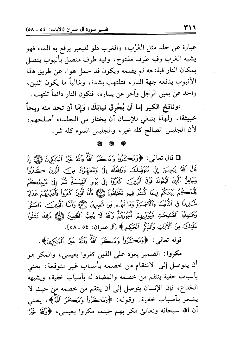 مكروا: الضمير يعود على الذين كفروا بعيسى، والمكر هو أن يتوصل إلى الانتقام من خصمه بأسباب غير متوقعة، يعني بأسباب خفية ينتقم من خصمه والمضاد له بأسباب خفية، ويشبهه الخداع، فإن الإنسان يتوصل إلى أن ينتقم من خصمه من حيث لا يشعر بأسباب خفية. وقوله: {وَمَكَرُوا وَمَكَرَ اللَّهُ}، يعني أن الله سبحانه وتعالى مكر بهم حينما مكروا بعيسى، {وَاللَّهُ خَيْرُ