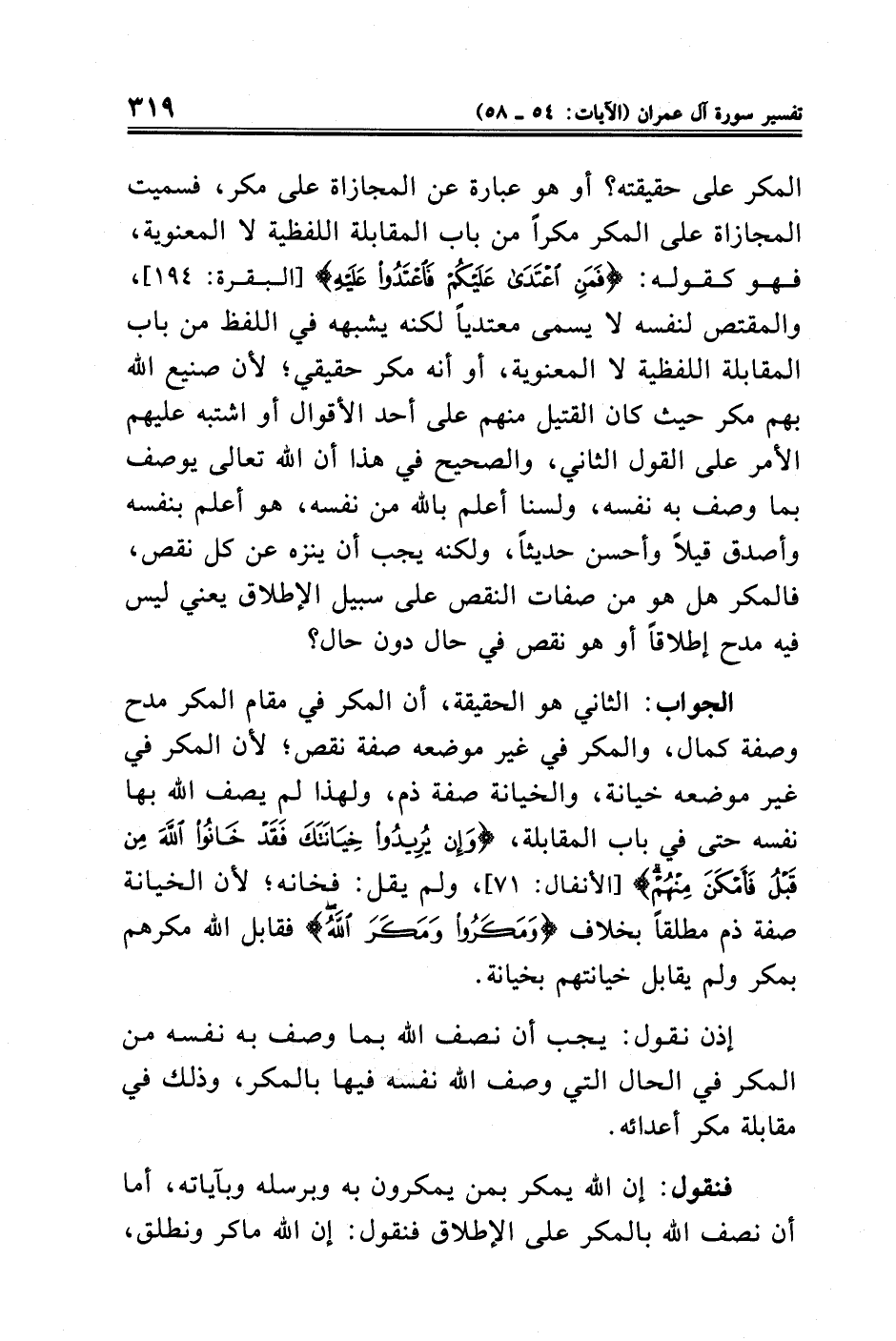 إذن نقول: يجب أن نصف الله بما وصف به نفسه من المكر في الحال التي وصف الله فيها بالمكر، وذلك في مقابلة مكر أعدائه.