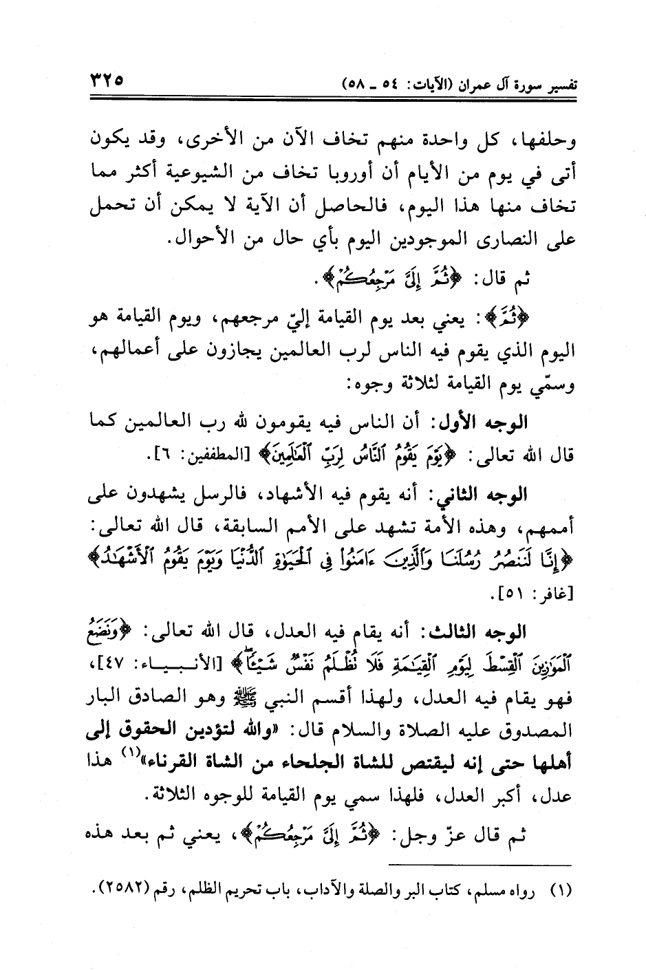 الوجه الثالث: أنه يقام فيه العدل، قال الله تعالى: {وَنَضَعُ الْمَوَازِينَ الْقِسْطَ لِيَوْمِ الْقِيَامَةِ فَلَا تُظْلَمُ نَفْسٌ شَيْئًا} [الأنبياء: ٤٧]، فهو يقام فيه العدل، ولهذا أقسم النبي - صلى الله عليه وسلم - وهو الصادق البار المصدوق عليه الصلاة والسلام قال: "والله لتؤدين الحقوق إلى أهلها حتى إنه ليقتص للشاة الجلحاء من الشاة القرناء" (¬١) هذا عدل، أكبر العدل، فلهذا سمي يوم القيامة للوجوه الثلاثة.