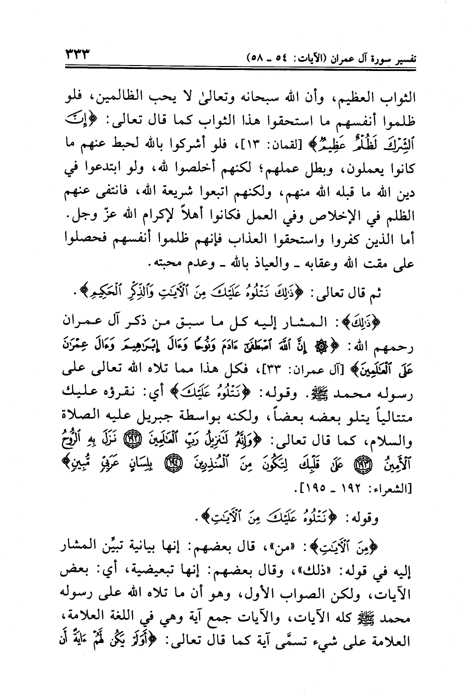 {ذَلِكَ}: المشار إليه كل ما سبق من ذكر آل عمران رحمهم الله: {إِنَّ اللَّهَ اصْطَفَى آدَمَ وَنُوحًا وَآلَ إِبْرَاهِيمَ وَآلَ عِمْرَانَ عَلَى الْعَالَمِينَ} [آل عمران: ٣٣]، فكل هذا مما تلاه الله تعالى على رسوله محمد - صلى الله عليه وسلم -. وقوله: {نَتْلُوهُ عَلَيْكَ} أي: نقرؤه عليك متتاليًا يتلو بعضه بعضًا، ولكنه بواسطة جبريل عليه الصلاة والسلام، كما قال تعالى: {وَإِنَّهُ لَتَنْزِيلُ رَبِّ الْعَالَمِينَ (١٩٢) نَزَلَ بِهِ الرُّوحُ الْأَمِينُ (١٩٣) عَلَى قَلْبِكَ لِتَكُونَ مِنَ الْمُنْذِرِينَ (١٩٤) بِلِسَانٍ عَرَبِيٍّ مُبِينٍ} [الشعراء: ١٩٢ - ١٩٥].