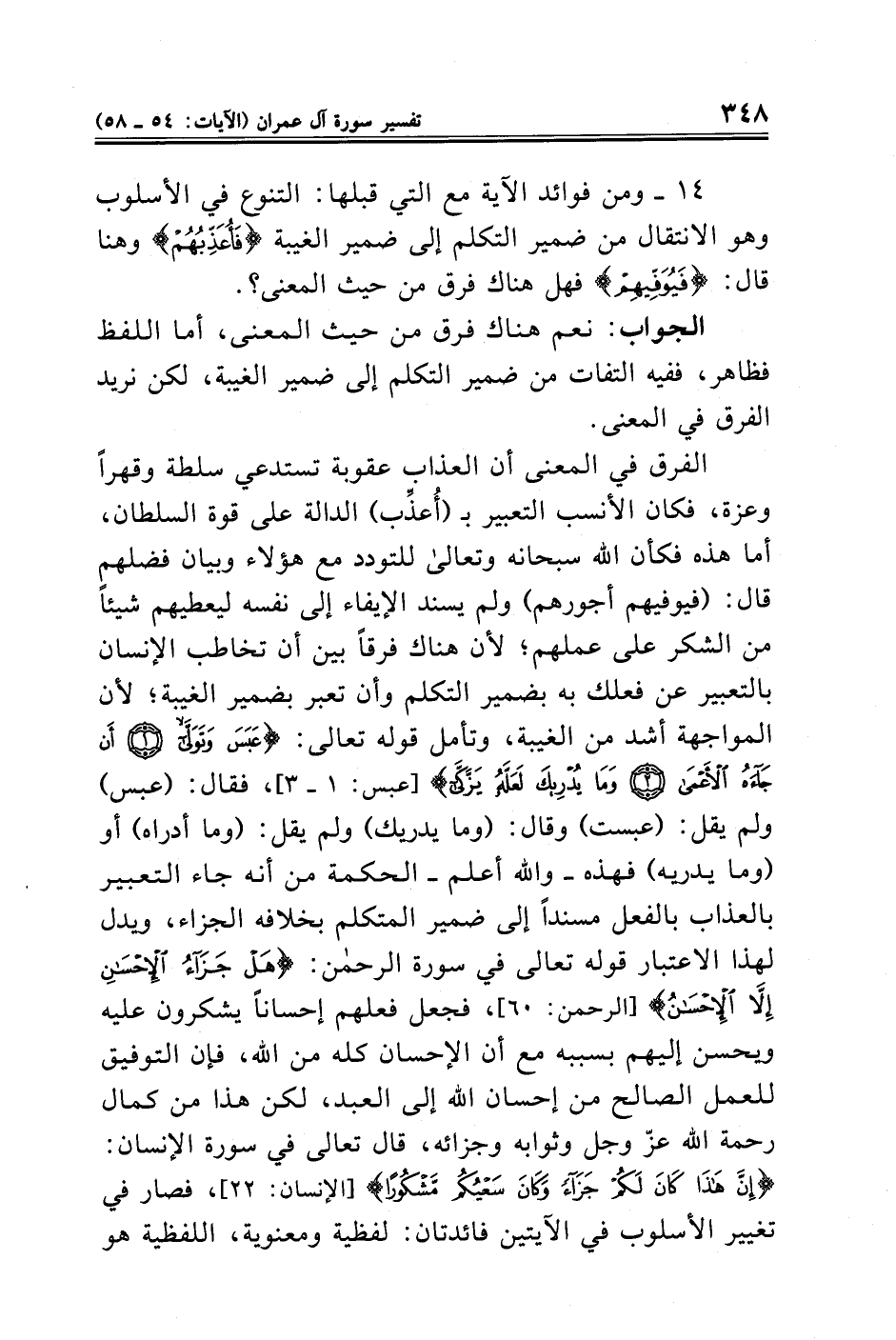 ١٤ - ومن فوائد الآية مع التي قبلها: التنوع في الأسلوب وهو الانتقال من ضمير التكلم إلى ضمير الغيبة {فَأُعَذِّبُهُمْ} وهنا قال: {فَيُوَفِّيهِمْ} فهل هناك فرق من حيث المعنى؟ .