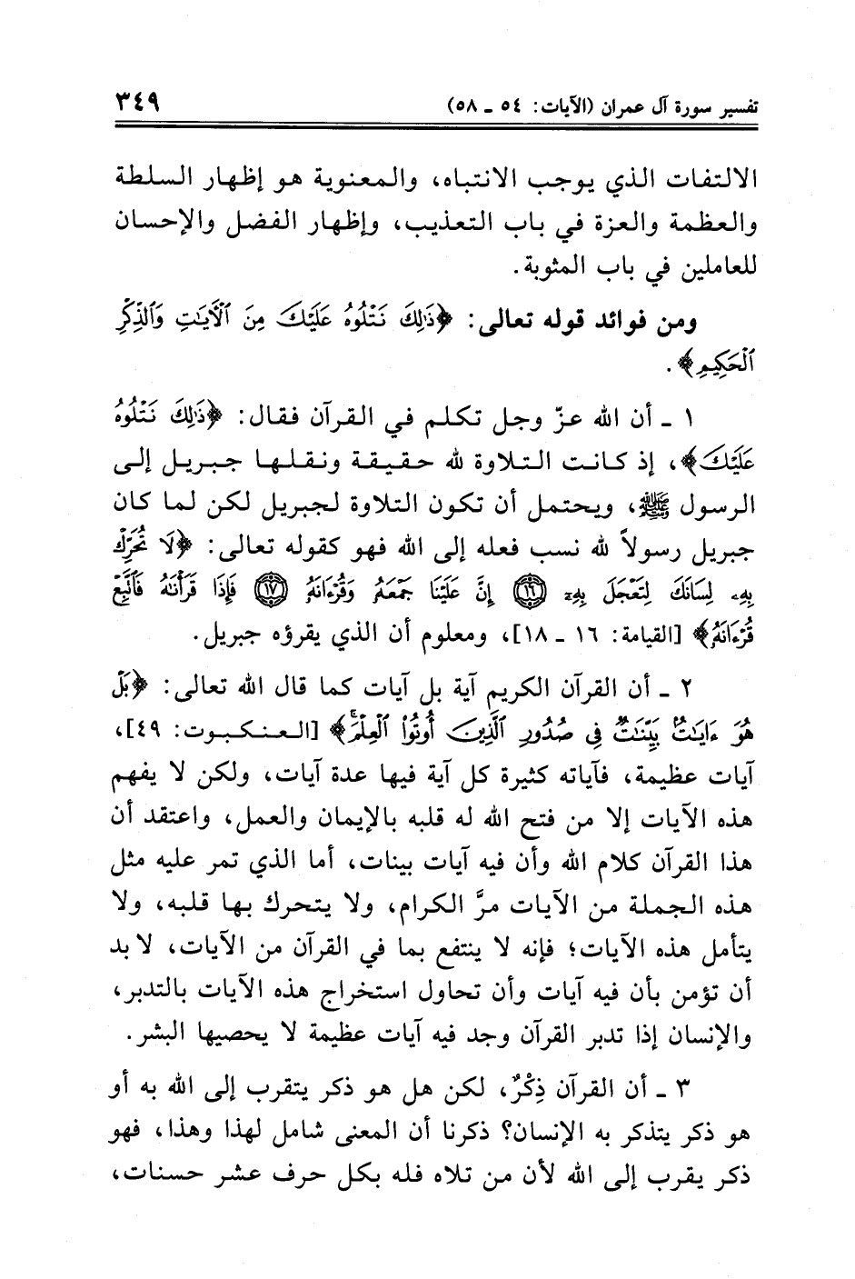 ١ - أن الله عزّ وجل تكلم في القرآن فقال: {ذَلِكَ نَتْلُوهُ عَلَيْكَ}، إذ كانت التلاوة لله حقيقة ونقلها جبريل إلى الرسول - صلى الله عليه وسلم -، ويحتمل أن تكون التلاوة لجبريل لكن لما كان جبريل رسولًا لله نسب فعله إلى الله فهو كقوله تعالى: {لَا تُحَرِّكْ بِهِ لِسَانَكَ لِتَعْجَلَ بِهِ (١٦) إِنَّ عَلَيْنَا جَمْعَهُ وَقُرْآنَهُ (١٧) فَإِذَا قَرَأْنَاهُ فَاتَّبِعْ قُرْآنَهُ} [القيامة: ١٦ - ١٨]، ومعلوم أن الذي يقرؤه جبريل.
