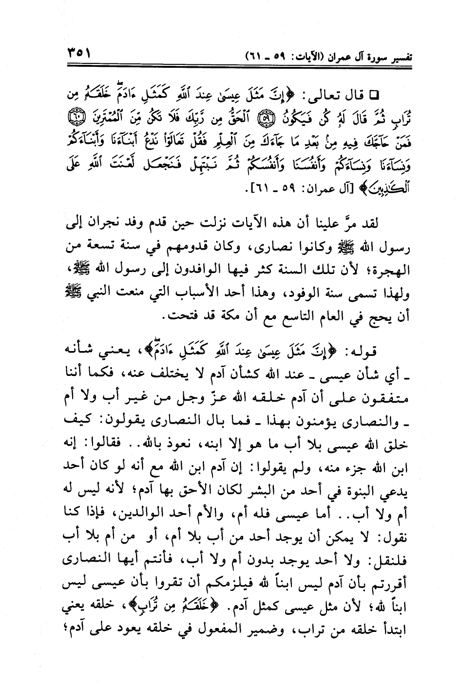 • قال تعالى: {إِنَّ مَثَلَ عِيسَي عِنْدَ اللَّهِ كَمَثَلِ آدَمَ خَلَقَهُ مِنْ تُرَابٍ ثُمَّ قَالَ لَهُ كُنْ فَيَكُونُ (٥٩) الْحَقُّ مِنْ رَبِّكَ فَلَا تَكُنْ مِنَ الْمُمْتَرِينَ (٦٠) فَمَنْ حَاجَّكَ فِيهِ مِنْ بَعْدِ مَا جَاءَكَ مِنَ الْعِلْمِ فَقُلْ تَعَالَوْا نَدْعُ أَبْنَاءَنَا وَأَبْنَاءَكُمْ وَنِسَاءَنَا وَنِسَاءَكُمْ وَأَنْفُسَنَا وَأَنْفُسَكُمْ ثُمَّ نَبْتَهِلْ فَنَجْعَلْ لَعْنَتَ اللَّهِ عَلَي الْكَاذِبِينَ} [آل عمران: ٥٩ - ٦١].