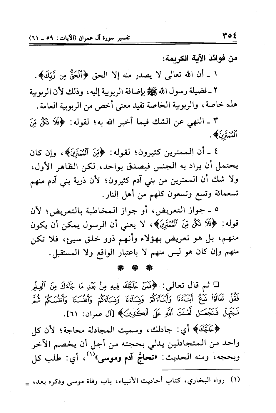 • ثم قال تعالى: {فَمَنْ حَاجَّكَ فِيهِ مِنْ بَعْدِ مَا جَاءَكَ مِنَ الْعِلْمِ فَقُلْ تَعَالَوْا نَدْعُ أَبْنَاءَنَا وَأَبْنَاءَكُمْ وَنِسَاءَنَا وَنِسَاءَكُمْ وَأَنْفُسَنَا وَأَنْفُسَكُمْ ثُمَّ نَبْتَهِلْ فَنَجْعَلْ لَعْنَتَ اللَّهِ عَلَى الْكَاذِبِينَ} [آل عمران: ٦١].
