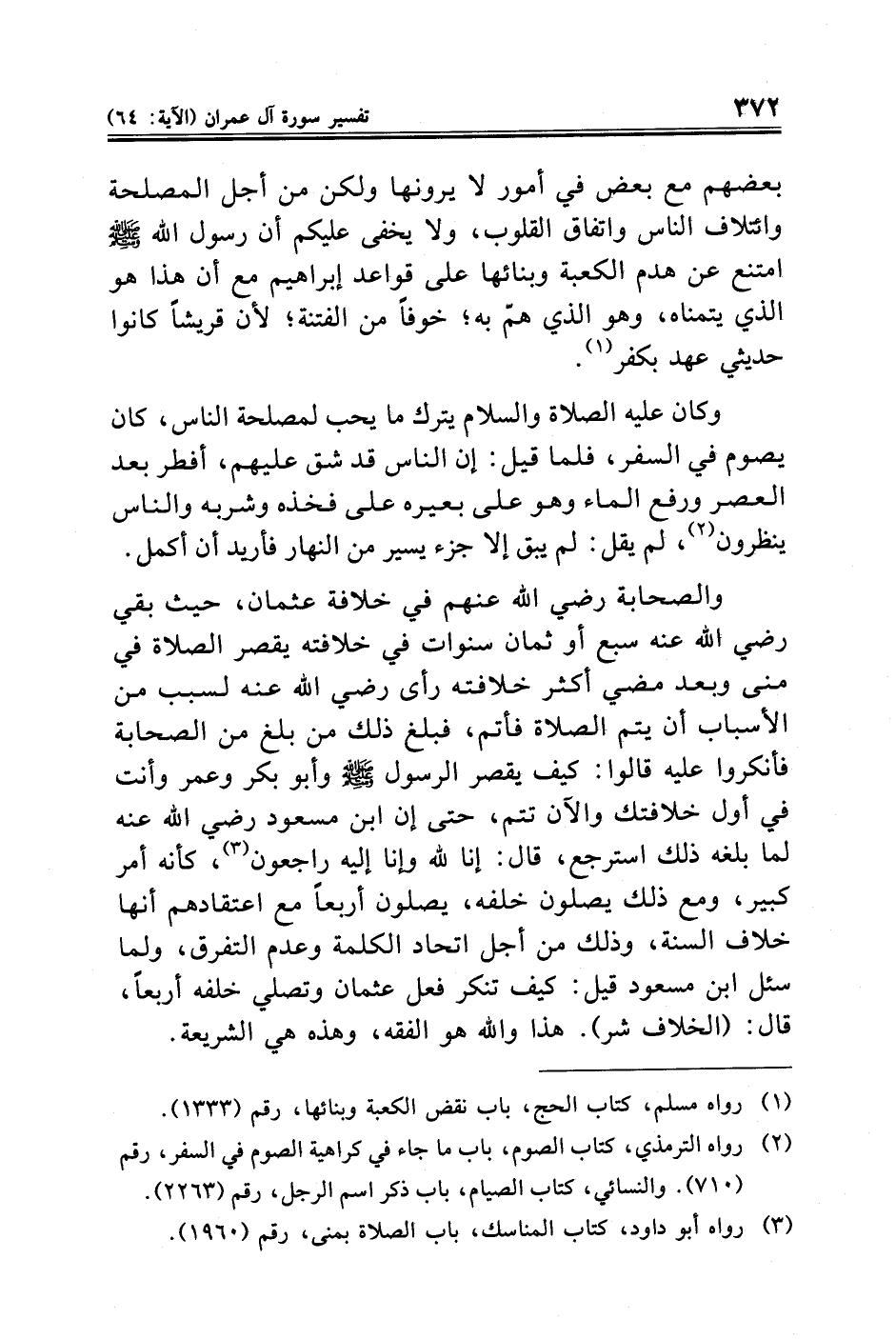 - رضي الله عنه - سبع أو ثمان سنوات في خلافته يقصر الصلاة في مني وبعد مضي أكثر خلافته رأي - رضي الله عنه - لسبب من الأسباب أن يتم الصلاة فأتم، فبلغ ذلك من بلغ من الصحابة فأنكروا عليه قالوا: كيف يقصر الرسول - صلى الله عليه وسلم - وأبو بكر وعمر وأنت في أول خلافتك والآن تتم، حتى إن ابن مسعود - رضي الله عنه - لما بلغه ذلك استرجع، قال: إنا لله وإنا إليه راجعون (¬١)، كأنه أمر كبير، ومع ذلك يصلون خلفه، يصلون أربعًا مع اعتقادهم أنها خلاف السنة، وذلك من أجل اتحاد الكلمة وعدم التفرق، ولما سئل ابن مسعود قيل: كيف تنكر فعل عثمان وتصلي خلفه أربعًا، قال: (الخلاف شر). هذا والله هو الفقه، وهذه هي الشريعة.