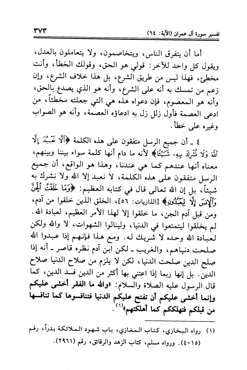 ٦ - أن الحكم بين الناس والعبادة مقترنان؛ لأن الله قرن بينهما، {أَلَّا نَعْبُدَ إِلَّا اللَّهَ وَلَا نُشْرِكَ بِهِ شَيْئًا وَلَا يَتَّخِذَ بَعْضُنَا بَعْضًا أَرْبَابًا مِنْ دُونِ اللَّهِ}، لأنك لن تعبد الله إلا بشريعته، إذن يلزم أن يكون المشرع هو المعبود. ما دمت تعبد الله فلن تعبده إلا بشريعته. فالمشرع هو المعبود الذي يعبد، لأنه سنَّ طريقًا أو وضع طريقًا وقال: اسلكوا هذا لتصلوا إلي، إذن كل طريق يخالفه فلن يوصل إلي الله، وهذا وجه التلازم بين قوله: (أن لا نعبد) وقوله: (ولا يتخذ)، فإن من اتخذ ربًّا من دون الله يتبعه في التحليل والتحريم فإنه لم يعبد الله؛ لأن عبادة الله لا تكون إلا بموافقة الشرع.