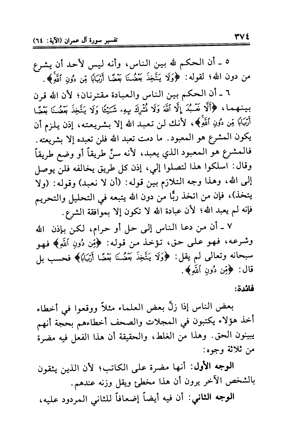 ٧ - أن من دعا الناس إلى حل أو حرام، لكن بإذن الله وشرعه، فهو علي حق، تؤخذ من قوله: {مِنْ دُونِ اللَّهِ} فهو سبحانه وتعالى لم يقل: {وَلَا يَتَّخِذَ بَعْضُنَا بَعْضًا أَرْبَابًا} فحسب بل قال: {مِنْ دُونِ اللَّهِ}.