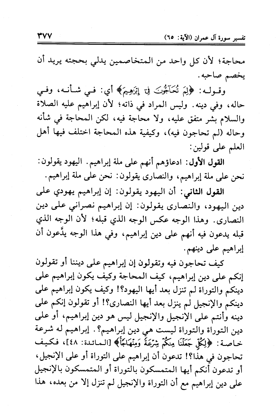القول الثاني: أن اليهود يقولون: إن إبراهيم يهودي علي دين اليهود، والنصاري يقولون: إن إبراهيم نصراني علي دين النصاري. وهذا الوجه عكس الوجه الذي قبله؛ لأن الوجه الذي قبله يدعون فيه أنهم علي دين إبراهيم، وفي هذا الوجه يدَّعون أن إبراهيم علي دينهم.