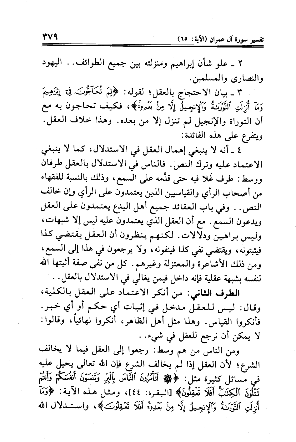٤ - أنه لا ينبغي إهمال العقل في الاستدلال، كما لا ينبغي الاعتماد عليه وترك النص. فالناس في الاستدلال بالعقل طرفان ووسط: طرف غَلا فيه حتى قدَّمه على السمع، وذلك بالنسبة للفقهاء من أصحاب الرأي والقياسيين الذين يعتمدون على الرأي وإن خالف النص .. وفي باب العقائد جميع أهل البدع يعتمدون علي العقل ويدعون السمع. مع أن العقل الذي يعتمدون عليه ليس إلا شبهات، وليس براهين ودلالات. لكنهم ينظرون أن العقل يقتضي كذا فيثبتونه، ويقتضي نفي كذا فينفونه، ولا يرجعون في هذا إلي السمع، ومن ذلك الأشاعرة والمعتزلة وغيرهم. كل من نفي صفة أثبتها الله لنفسه بشبهة عقلية فإنه داخل فيمن يغالي في الاستدلال بالعقل ..