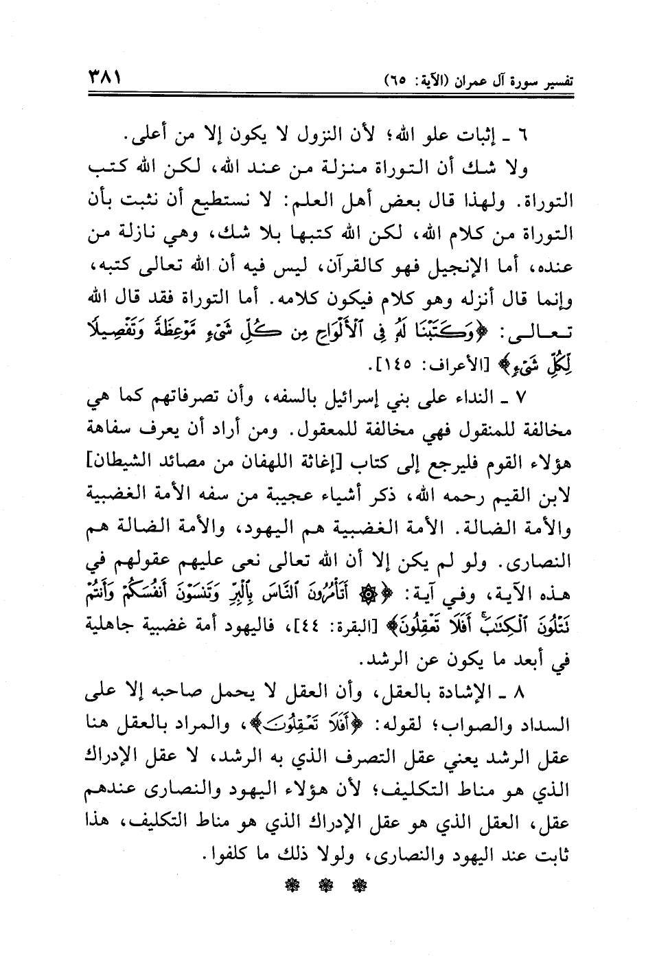 ٨ - الإشادة بالعقل، وأن العقل لا يحمل صاحبه إلا علي السداد والصواب؛ لقوله: {أَفَلَا تَعْقِلُونَ}، والمراد بالعقل هنا عقل الرشد يعني عقل التصرف الذي به الرشد، لا عقل الإدراك الذي هو مناط التكليف؛ لأن هؤلاء اليهود والنصاري عندهم عقل، العقل الذي هو عقل الإدراك الذي هو مناط التكليف، هذا ثابت عند اليهود والنصاري، ولولا ذلك ما كلفوا.