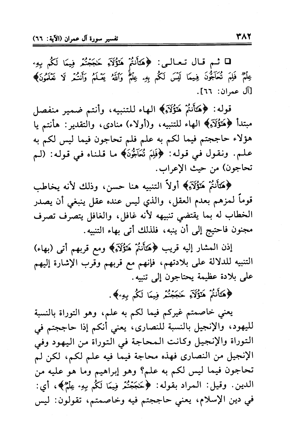 • ثم قال تعالى: {هَاأَنْتُمْ هَؤُلَاءِ حَاجَجْتُمْ فِيمَا لَكُمْ بِهِ عِلْمٌ فَلِمَ تُحَاجُّونَ فِيمَا لَيْسَ لَكُمْ بِهِ عِلْمٌ وَاللَّهُ يَعْلَمُ وَأَنْتُمْ لَا تَعْلَمُونَ} [آل عمران: ٦٦].