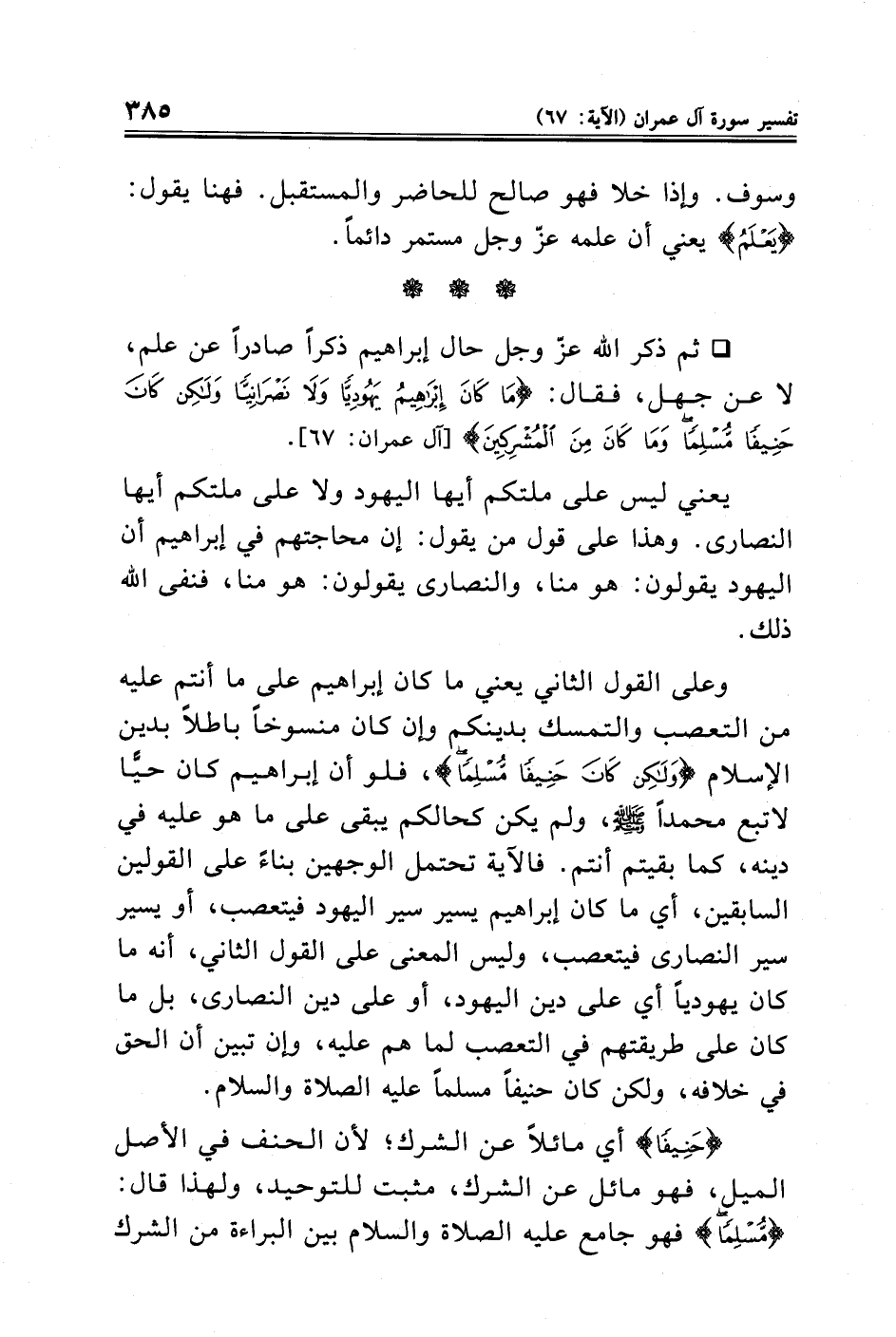 • ثم ذكر الله عزّ وجل حال إبراهيم ذكرًا صادرًا عن علم، لا عن جهل، فقال: {مَا كَانَ إِبْرَاهِيمُ يَهُودِيًّا وَلَا نَصْرَانِيًّا وَلَكِنْ كَانَ حَنِيفًا مُسْلِمًا وَمَا كَانَ مِنَ الْمُشْرِكِينَ} [آل عمران: ٦٧].
