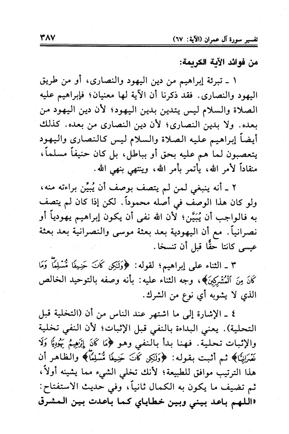 ٤ - الإشارة إلي ما اشتهر عند الناس من أن (التخلية قبل التحلية). يعني البداءة بالنفي قبل الإثبات؛ لأن النفي تخلية والإثبات تحلية. فهنا بدأ بالنفي وهو {مَا كَانَ إِبْرَاهِيمُ يَهُودِيًّا وَلَا نَصْرَانِيًّا} ثم أثبت بقوله: {وَلَكِنْ كَانَ حَنِيفًا مُسْلِمًا} والظاهر أن هذا الترتيب موافق للطبيعة؛ لأنك تخلي الشيء مما يشينه أولًا، ثم تضيف ما يكون به الكمال ثانيًا، وفي حديث الاستفتاح: "اللهم باعد بيني وبين خطاياي كما باعدت بين المشرق