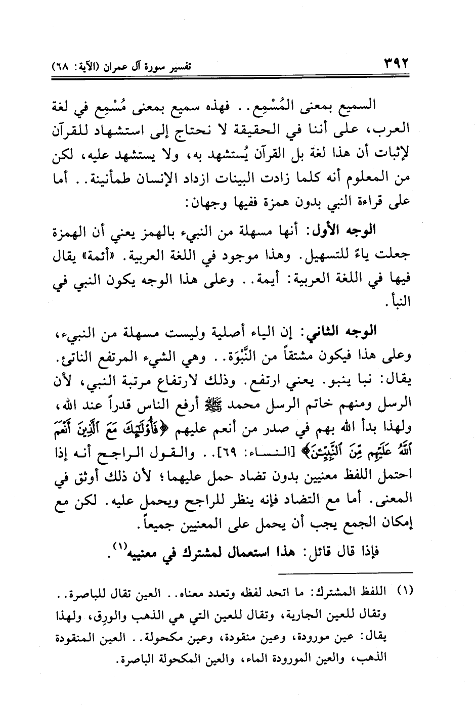 الوجه الثاني: إن الياء أصلية وليست مسهلة من النبيء، وعلي هذا فيكون مشتقًا من النَّبْوَة .. وهي الشيء المرتفع الناتئ. يقال: نبا ينبو. يعني ارتفع. وذلك لارتفاع مرتبة النبي، لأن الرسل ومنهم خاتم الرسل محمد - صلى الله عليه وسلم - أرفع الناس قدرًا عند الله، ولهذا بدأ الله بهم في صدر من أنعم عليهم {فَأُولَئِكَ مَعَ الَّذِينَ أَنْعَمَ اللَّهُ عَلَيْهِمْ مِنَ النَّبِيِّينَ} [النساء: ٦٩] .. والقول الراجح أنه إذا احتمل اللفظ معنيين بدون تضاد حمل عليهما؛ لأن ذلك أوثق في المعني. أما مع التضاد فإنه ينظر للراجح ويحمل عليه. لكن مع إمكان الجمع يجب أن يحمل علي المعنيين جميعًا.