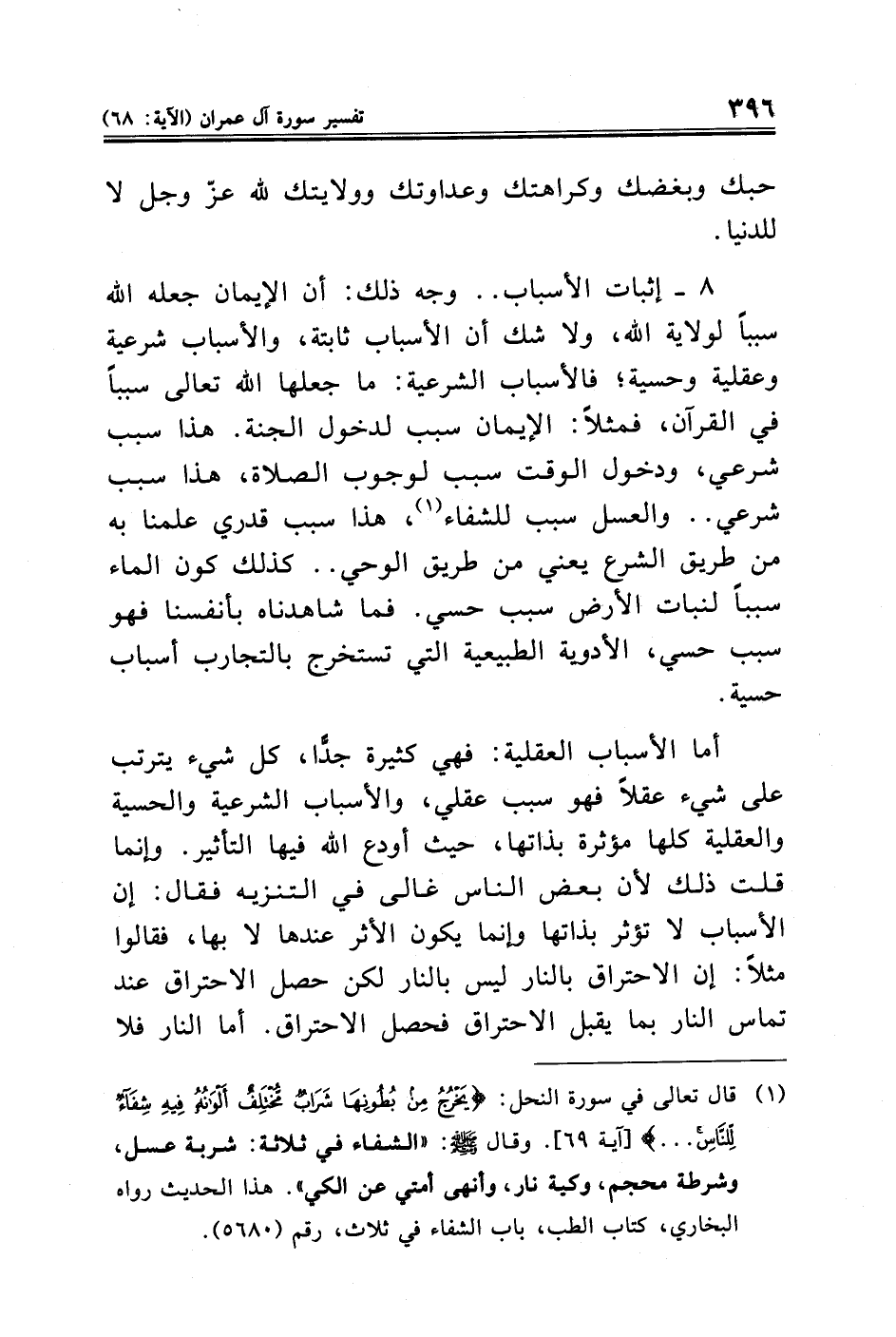 ٨ - إثبات الأسباب .. وجه ذلك: أن الإيمان جعله الله سببًا لولاية الله، ولا شك أن الأسباب ثابتة، والأسباب شرعية وعقلية وحسية؛ فالأسباب الشرعية: ما جعلها الله تعالى سببًا في القرآن، فمثلًا: الإيمان سبب لدخول الجنة. هذا سبب شرعي، ودخول الوقت سبب لوجوب الصلاة، هذا سبب شرعي .. والعسل سبب للشفاء (¬١)، هذا سبب قدري علمنا به من طريق الشرع يعني من طريق الوحي .. كذلك كون الماء سببًا لنبات الأرض سبب حسي. فما شاهدناه بأنفسنا فهو سبب حسي، الأدوية الطبيعية التي تستخرج بالتجارب أسباب حسية.