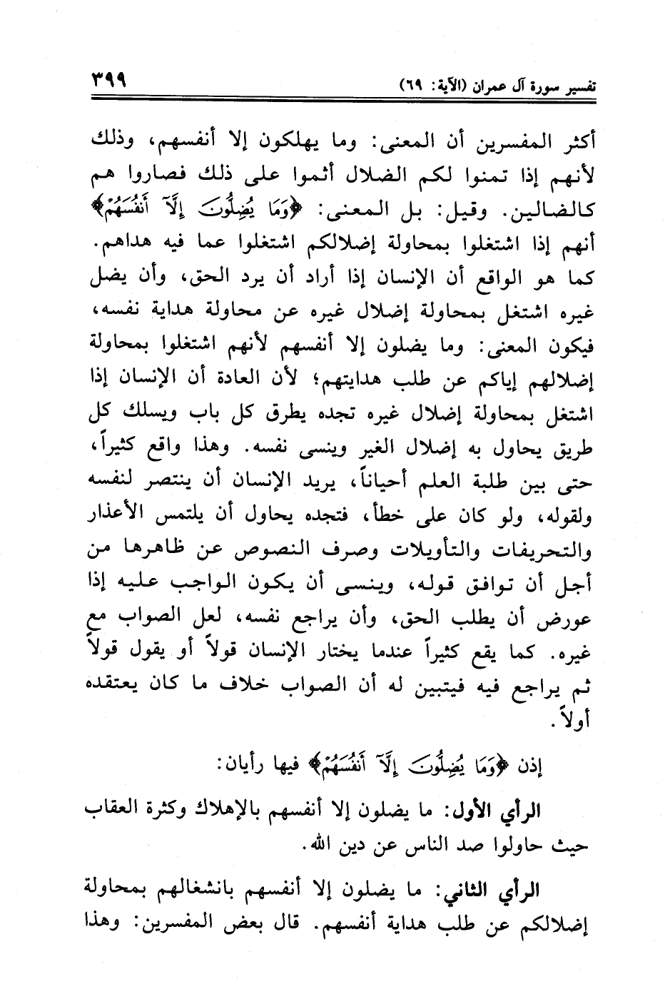 أكثر المفسرين أن المعني: وما يهلكون إلا أنفسهم، وذلك لأنهم إذا تمنوا لكم الضلال أثموا علي ذلك فصاروا هم كالضالين. وقيل: بل المعني: {وَمَا يُضِلُّونَ إِلَّا أَنْفُسَهُمْ} أنهم إذا اشتغلوا بمحاولة إضلالكم اشتغلوا عما فيه هداهم. كما هو الواقع أن الإنسان إذا أراد أن يرد الحق، وأن يضل غيره اشتغل بمحاولة إضلال غيره عن محاولة هداية نفسه، فيكون المعني: وما يضلون إلا أنفسهم لأنهم اشتغلوا بمحاولة إضلالهم إياكم عن طلب هدايتهم؛ لأن العادة أن الإنسان إذا اشتغل بمحاولة إضلال غيره تجده يطرق كل باب ويسلك كل طريق يحاول به إضلال الغير وينسي نفسه. وهذا واقع كثيرًا، حتى بين طلبة العلم أحيانًا، يريد الإنسان أن ينتصر لنفسه ولقوله، ولو كان علي خطأ، فتجده يحاول أن يلتمس الأعذار والتحريفات والتأويلات وصرف النصوص عن ظاهرها من أجل أن توافق قوله، وينسي أن يكون الواجب عليه إذا عورض أن يطلب الحق، وأن يراجع نفسه، لعل الصواب مع غيره. كما يقع كثيرًا عندما يختار الإنسان قولًا أو يقول قولًا ثم يراجع فيه فيتبين له أن الصواب خلاف ما كان يعتقده أولًا.