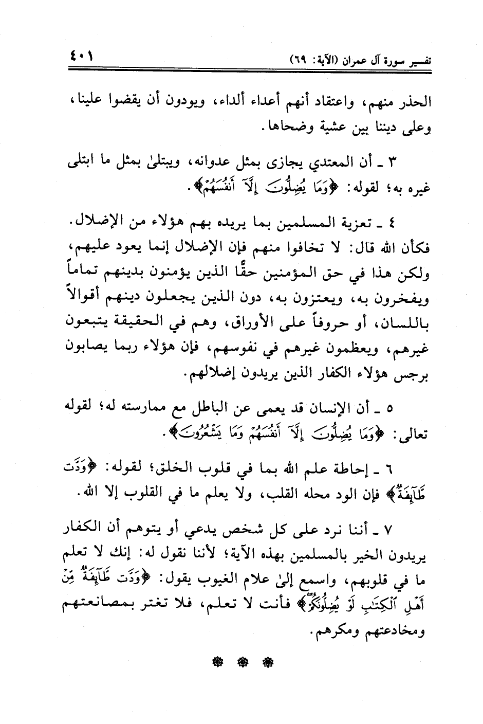 ٧ - أننا نرد على كل شخص يدعي أو يتوهم أن الكفار يريدون الخير بالمسلمين بهذه الآية؛ لأننا نقول له: إنك لا تعلم ما في قلوبهم، واسمع إلى علام الغيوب يقول: {وَدَّتْ طَائِفَةٌ مِنْ أَهْلِ الْكِتَابِ لَوْ يُضِلُّونَكُمْ} فأنت لا تعلم، فلا تغتر بمصانعتهم ومخادعتهم ومكرهم.