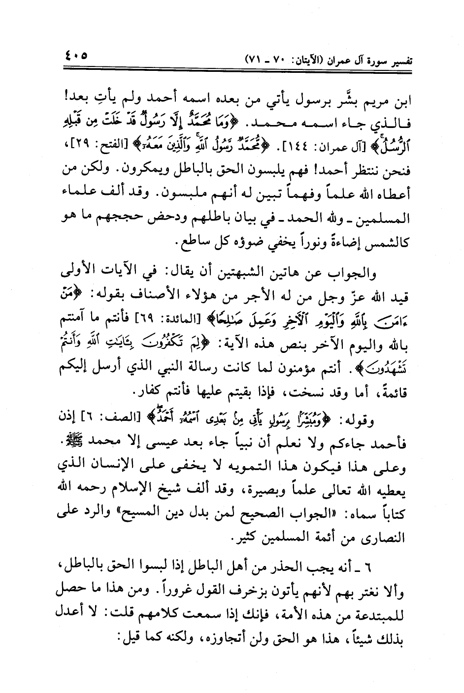 وقوله: {وَمُبَشِّرًا بِرَسُولٍ يَأْتِي مِنْ بَعْدِي اسْمُهُ أَحْمَدُ} [الصف: ٦] إذن فأحمد جاءكم ولا نعلم أن نبيًا جاء بعد عيسى إلا محمد - صلى الله عليه وسلم -. وعلى هذا فيكون هذا التمويه لا يخفى على الإنسان الذي يعطيه الله تعالى علمًا وبصيرة، وقد ألف شيخ الإسلام رحمه الله كتابًا سماه: "الجواب الصحيح لمن بدل دين المسيح" والرد على النصارى من أئمة المسلمين كثير.