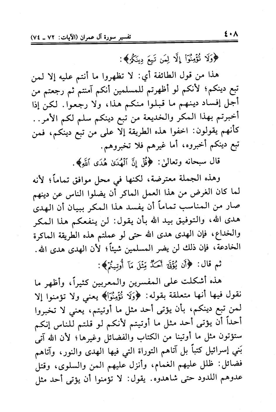 {وَلَا تُؤْمِنُوا إِلَّا لِمَنْ تَبِعَ دِينَكُمْ}: