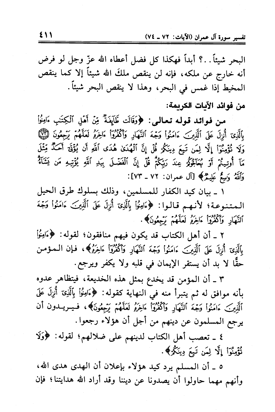٢ - أن أهل الكتاب قد يكون فيهم منافقون؛ لقوله: {آمِنُوا بِالَّذِي أُنْزِلَ عَلَى الَّذِينَ آمَنُوا وَجْهَ النَّهَارِ وَاكْفُرُوا آخِرَهُ}، فإن المؤمن حقًّا لابد أن يستقر الإيمان في قلبه ولا يكفر ويرجع.