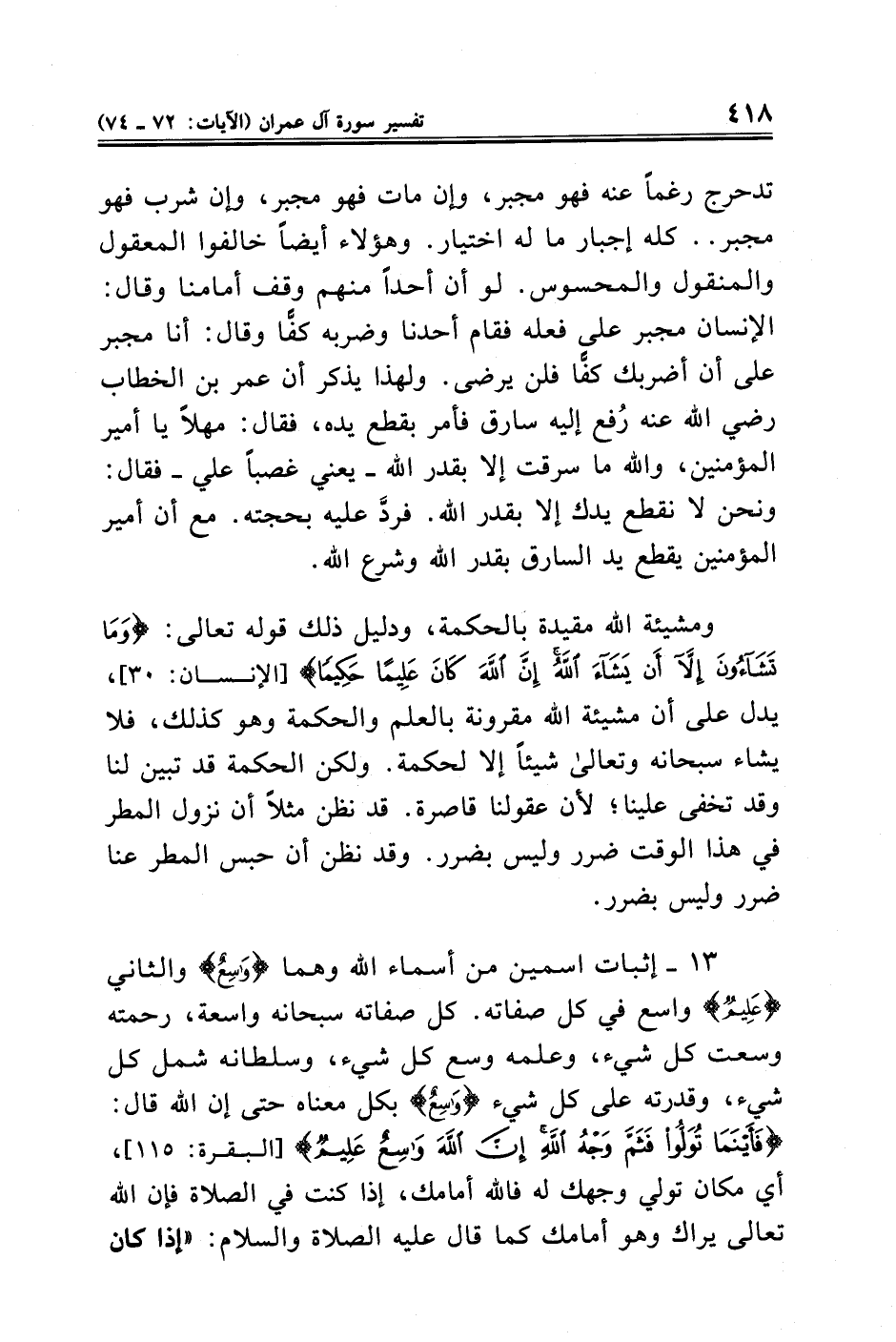 تدحرج رغمًا عنه فهو مجبر، وإن مات فهو مجبر، وإن شرب فهو مجبر .. كله إجبار ما له اختيار. وهؤلاء أيضًا خالفوا المعقول والمنقول والمحسوس. لو أن أحدًا منهم وقف أمامنا وقال: الإنسان مجبر على فعله فقام أحدنا وضربه كفًّا وقال: أنا مجبر على أن أضربك كفًّا فلن يرضى. ولهذا يذكر أن عمر بن الخطاب - رضي الله عنه - رُفع إليه سارق فأمر بقطع يده، فقال: مهلًا يا أمير المؤمنين، والله ما سرقت إلا بقدر الله -يعني غصبًا علي- فقال: ونحن لا نقطع يدك إلا بقدر الله. فردَّ عليه بحجته. مع أن أمير المؤمنين يقطع يد السارق بقدر الله وشرع الله.
