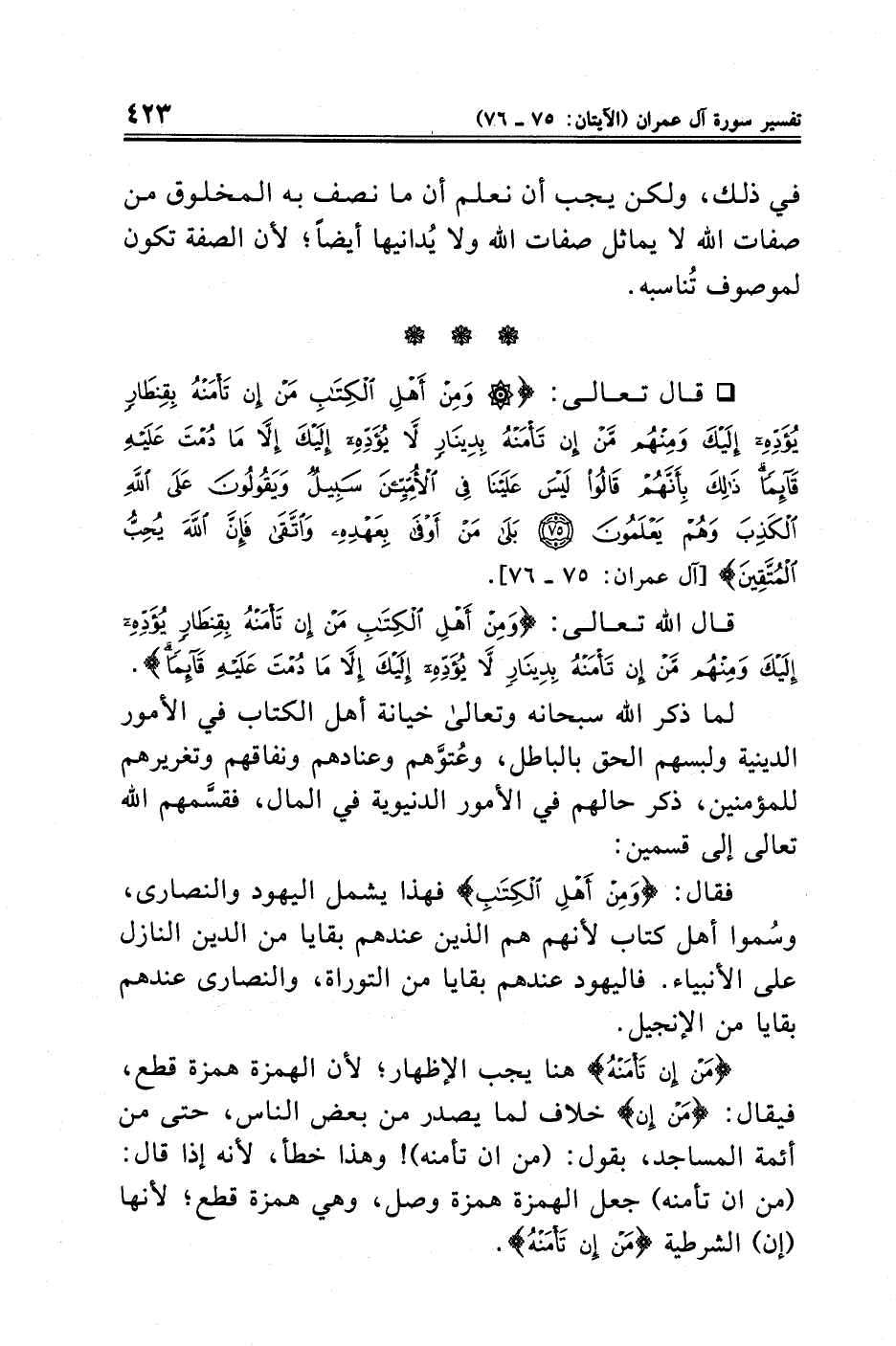 • قال تعالى: {وَمِنْ أَهْلِ الْكِتَابِ مَنْ إِنْ تَأْمَنْهُ بِقِنْطَارٍ يُؤَدِّهِ إِلَيْكَ وَمِنْهُمْ مَنْ إِنْ تَأْمَنْهُ بِدِينَارٍ لَا يُؤَدِّهِ إِلَيْكَ إِلَّا مَا دُمْتَ عَلَيْهِ قَائِمًا ذَلِكَ بِأَنَّهُمْ قَالُوا لَيْسَ عَلَيْنَا فِي الْأُمِّيِّينَ سَبِيلٌ وَيَقُولُونَ عَلَى اللَّهِ الْكَذِبَ وَهُمْ يَعْلَمُونَ (٧٥) بَلَى مَنْ أَوْفَى بِعَهْدِهِ وَاتَّقَى فَإِنَّ اللَّهَ يُحِبُّ الْمُتَّقِينَ} [آل عمران: ٧٥ - ٧٦].