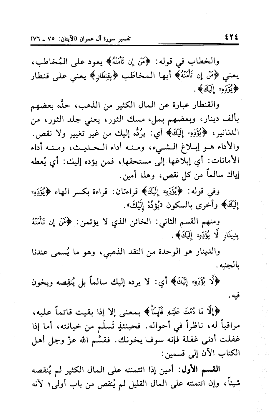 والقنطار عبارة عن المال الكثير من الذهب، حدَّه بعضهم بألف دينار، وبعضهم بملء مسك الثور، يعني جلد الثور، من الدنانير، {يُؤَدِّهِ إِلَيْكَ} أي: يرُدُّه إليك من غير تغيير ولا نقص. والأداء هو إبلاغ الشيء، ومنه أداء الحديث، ومنه أداء الأمانات: أي إبلاغها إلى مستحقها، فمن يؤده إليك: أي يُعطه إياك سالمًا من كل نقص، وهذا أمين.