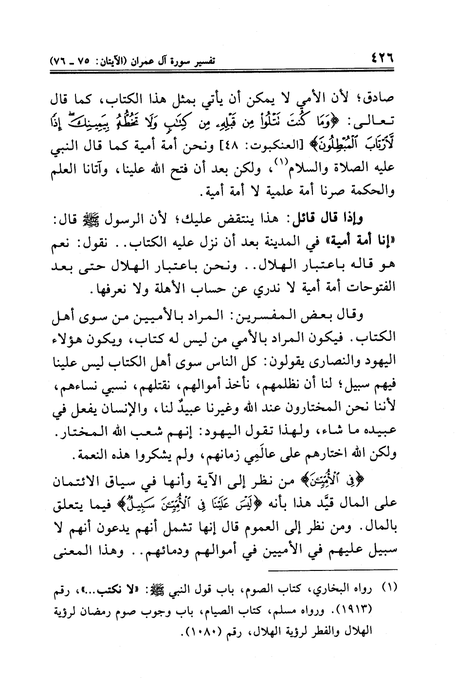 وإذا قال قائل: هذا ينتقض عليك؛ لأن الرسول - صلى الله عليه وسلم - قال: "إنا أمة أمية" في المدينة بعد أن نزل عليه الكتاب .. نقول: نعم هو قاله باعتبار الهلال .. ونحن باعتبار الهلال حتى بعد الفتوحات أمة أمية لا ندري عن حساب الأهلة ولا نعرفها.