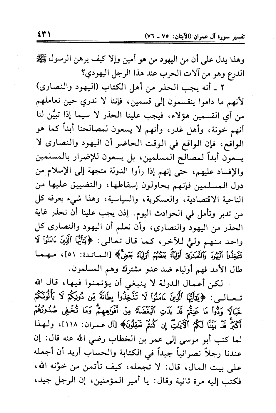 لكن أعمال الدولة لا ينبغي أن يؤتمنوا فيها، قال الله تعالى: {يَاأَيُّهَا الَّذِينَ آمَنُوا لَا تَتَّخِذُوا بِطَانَةً مِنْ دُونِكُمْ لَا يَأْلُونَكُمْ خَبَالًا وَدُّوا مَاعَنِتُّمْ قَدْ بَدَتِ الْبَغْضَاءُ مِنْ أَفْوَاهِهِمْ وَمَا تُخْفِي صُدُورُهُمْ أَكْبَرُ قَدْ بَيَّنَّا لَكُمُ الْآيَاتِ إِنْ كُنْتُمْ تَعْقِلُونَ} [آل عمران: ١١٨]، ولهذا لما كتب أبو موسى إلى عمر بن الخطاب - رضي الله عنه - قال: إن عندنا رجلًا نصرانيًا جيدًا في الكتابة والحساب أريد أن أجعله على بيت المال، قال: لا تجعله، كيف تأتمن من خوَّنه الله، فكتب إليه مرة ثانية وقال: يا أمير المؤمنين، إن الرجل جيد،