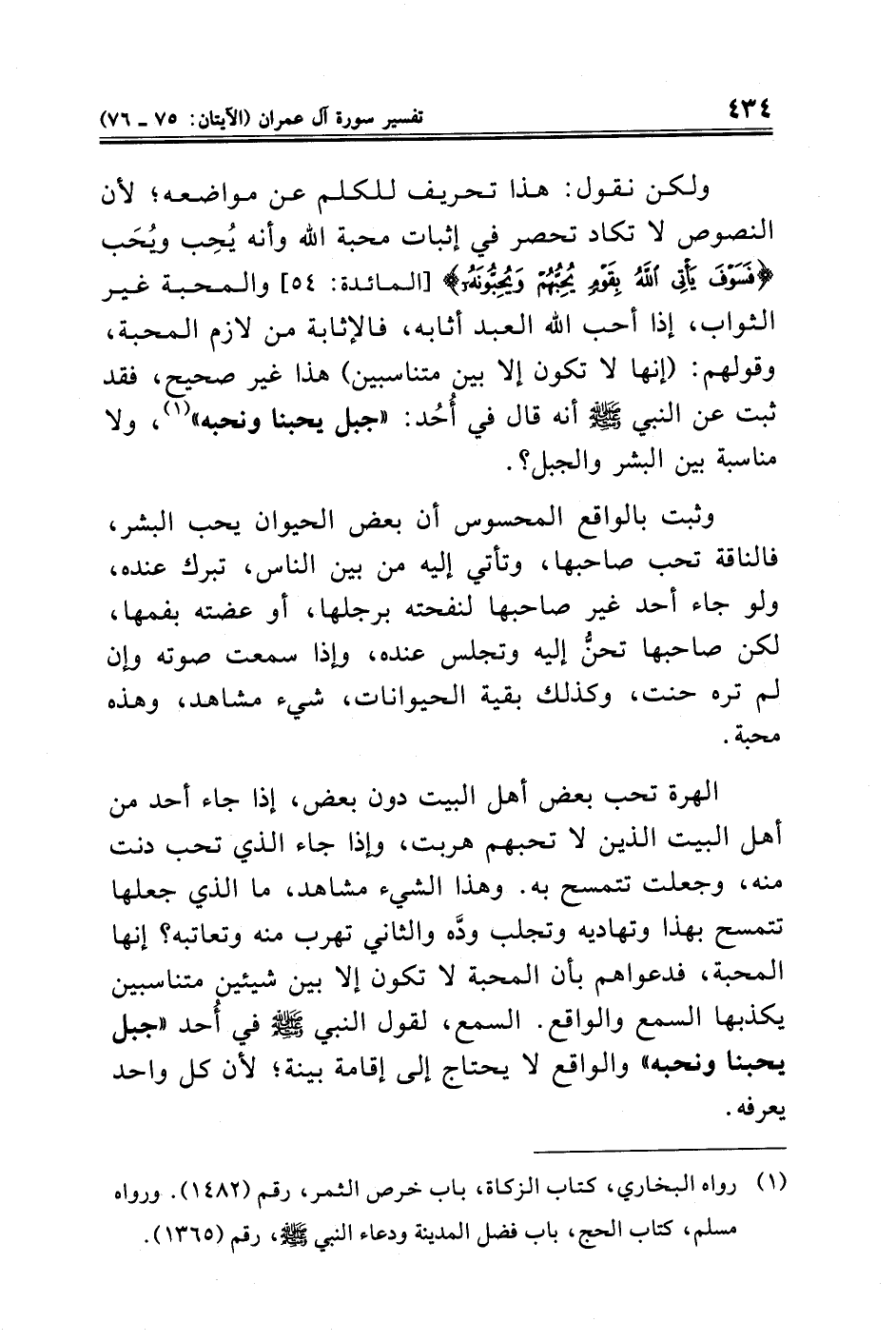 الهرة تحب بعض أهل البيت دون بعض، إذا جاء أحد من أهل البيت الذين لا تحبهم هربت، وإذا جاء الذي تحب دنت منه، وجعلت تتمسح به. وهذا الشيء مشاهد، ما الذي جعلها تتمسح بهذا وتهاديه وتجلب ودَّه والثاني تهرب منه وتعاتبه؟ إنها المحبة، فدعواهم بأن المحبة لا تكون إلا بين شيئين متناسبين يكذبها السمع والواقع. السمع، لقول النبي - صلى الله عليه وسلم - في أُحد "جبل يحبنا ونحبه" والواقع لا يحتاج إلى إقامة بينة؛ لأن كل واحد يعرفه.