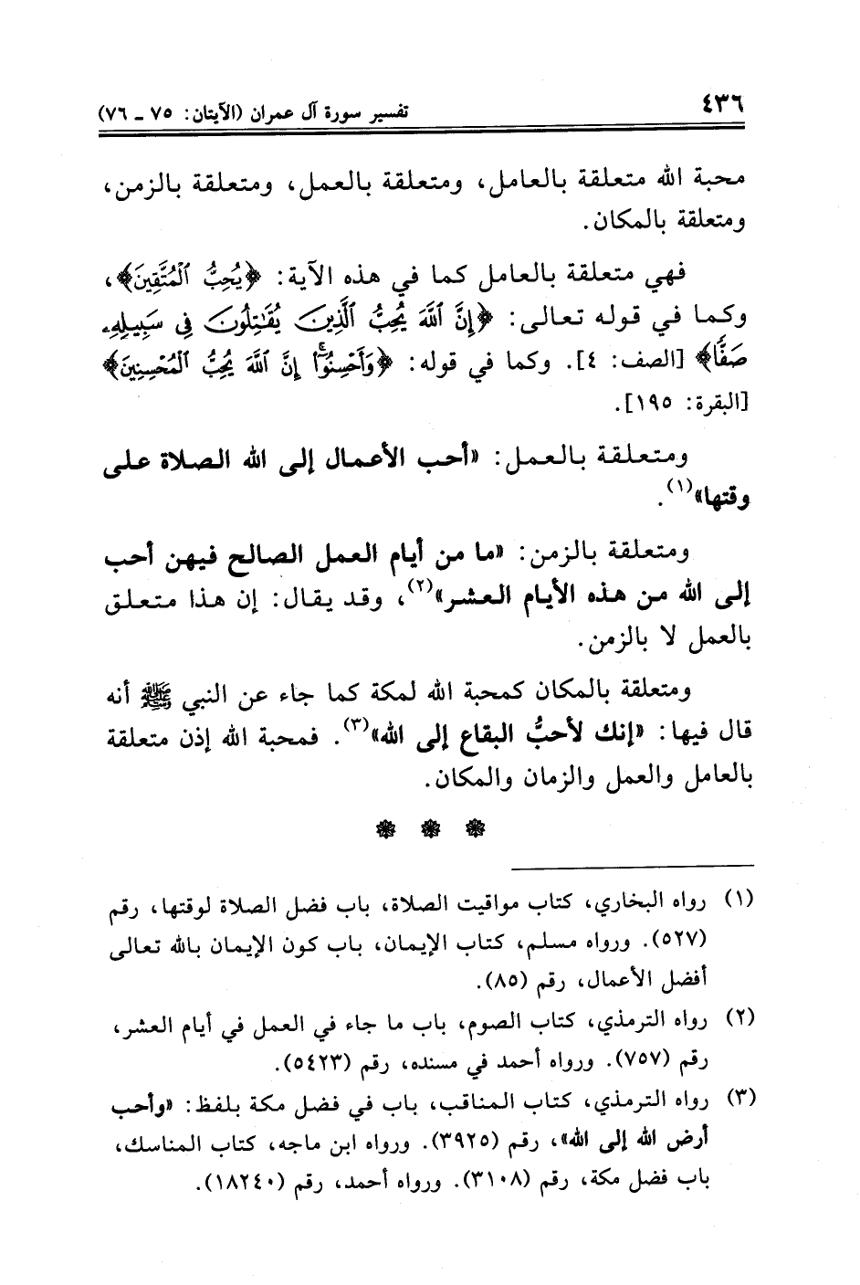 ومتعلقة بالمكان كمحبة الله لمكة كما جاء عن النبي - صلى الله عليه وسلم - أنه قال فيها: "إنك لأحبُّ البقاع إلى الله" (¬٣). فمحبة الله إذن متعلقة بالعامل والعمل والزمان والمكان.
