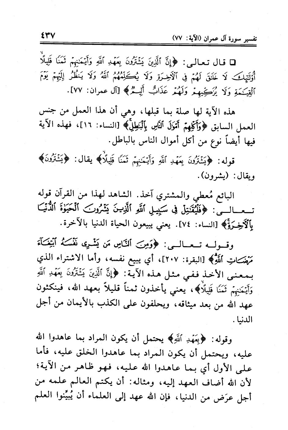 وقوله تعالى: {وَمِنَ النَّاسِ مَنْ يَشْرِي نَفْسَهُ ابْتِغَاءَ مَرْضَاتِ اللَّهِ} [البقرة: ٢٠٧]، أي يبيع نفسه، وأما الاشتراء الذي بمعنى الأخذ ففي مثل هذه الآية: {إِنَّ الَّذِينَ يَشْتَرُونَ بِعَهْدِ اللَّهِ وَأَيْمَانِهِمْ ثَمَنًا قَلِيلًا}، يعني يأخذون ثمنًا قليلًا بعهد الله، فينكثون عهد الله من بعد ميثاقه، ويحلفون على الكذب بالأيمان من أجل الدنيا.