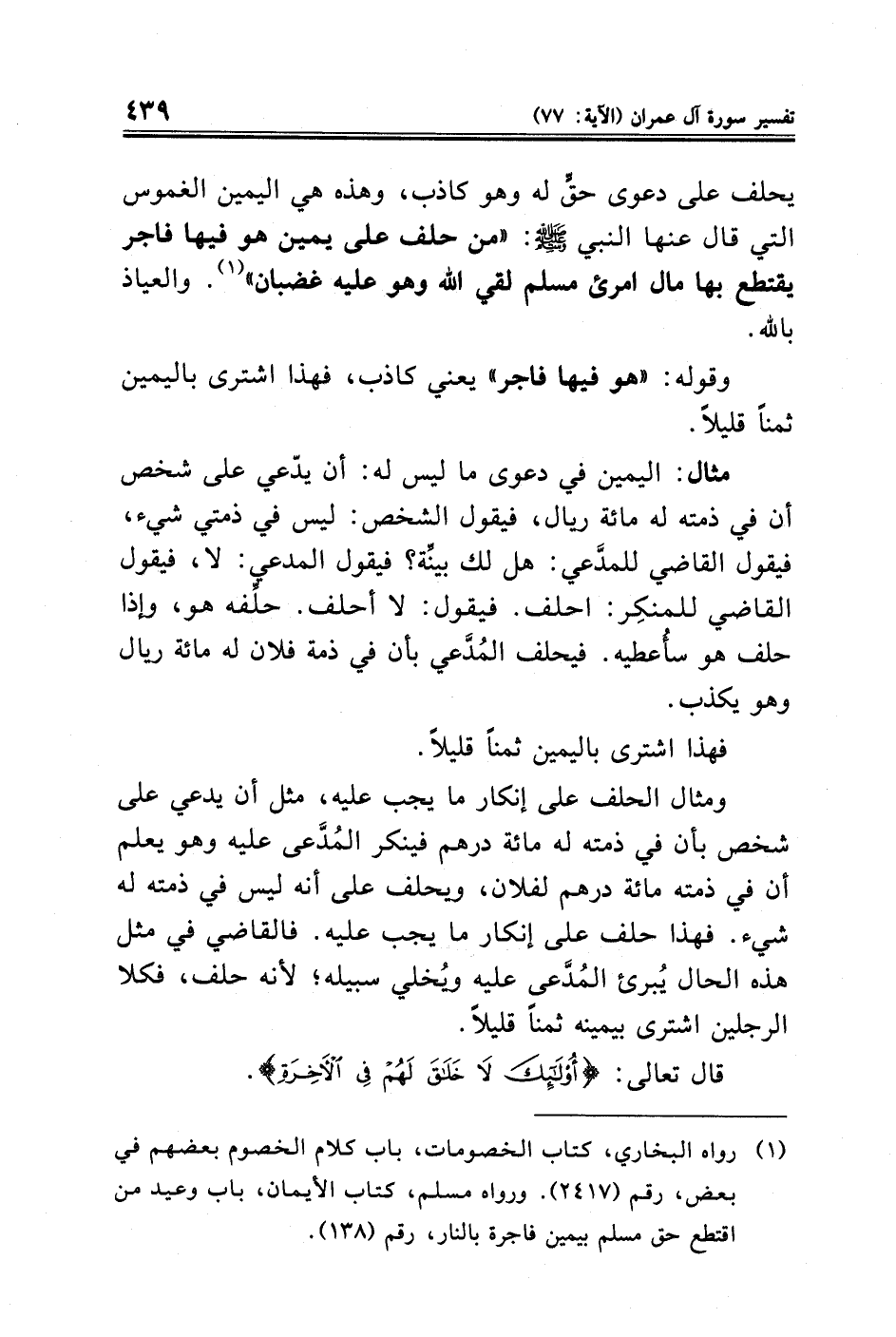 (¬١) رواه البخاري، كتاب الخصومات، باب كلام الخصوم بعضهم في بعض، رقم (٢٤١٧). ورواه مسلم، كتاب الأيمان، باب وعيد من اقتطع حق مسلم بيمين فاجرة بالنار، رقم (١٣٨).