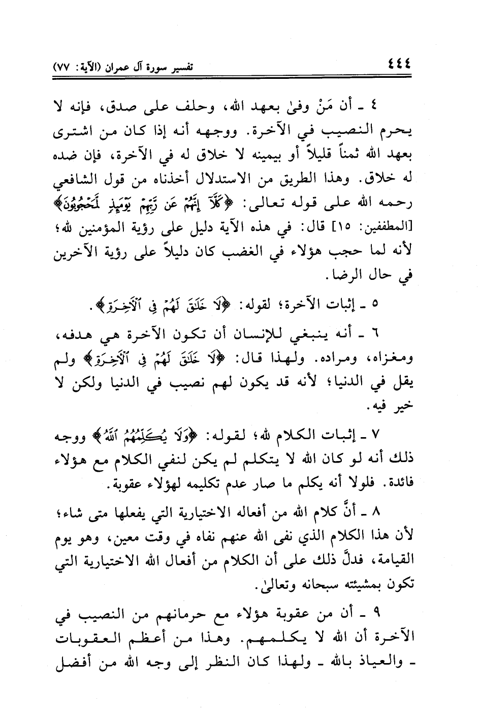 ٤ - أن مَنْ وفى بعهد الله، وحلف على صدق، فإنه لا يحرم النصيب في الآخرة. ووجهه أنه إذا كان من اشترى بعهد الله ثمنًا قليلًا أو بيمينه لا خلاق له في الآخرة، فإن ضده له خلاق. وهذا الطريق من الاستدلال أخذناه من قول الشافعي رحمه الله على قوله تعالى: {كَلَّا إِنَّهُمْ عَنْ رَبِّهِمْ يَوْمَئِذٍ لَمَحْجُوبُونَ} [المطففين: ١٥] قال: في هذه الآية دليل على رؤية المؤمنين لله؛ لأنه لما حجب هؤلاء في الغضب كان دليلًا على رؤية الآخرين في حال الرضا.