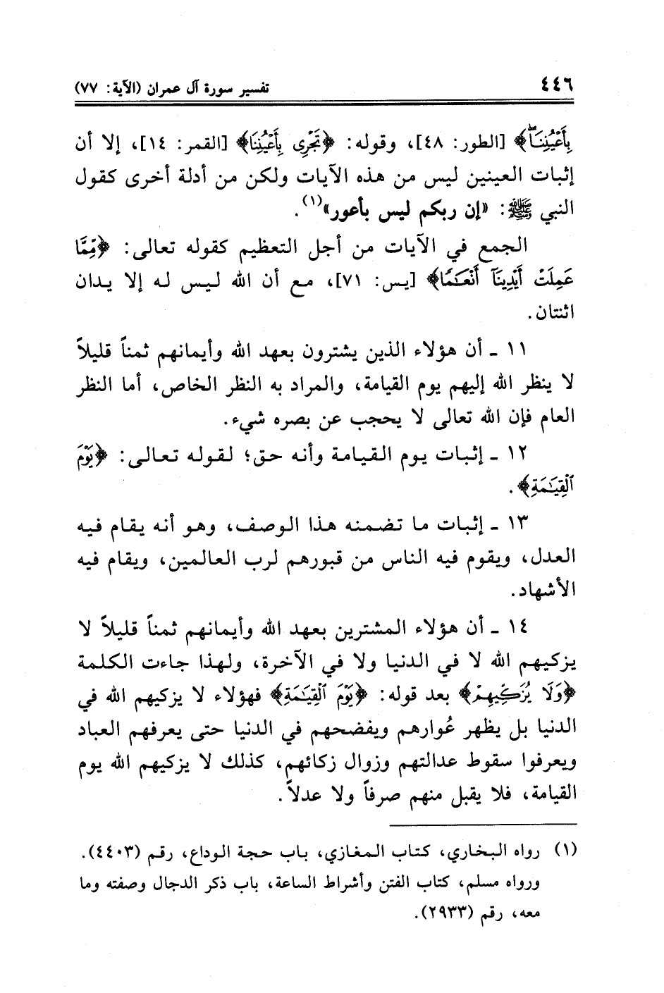 ١١ - أن هؤلاء الذين يشترون بعهد الله وأيمانهم ثمنًا قليلًا لا ينظر الله إليهم يوم القيامة، والمراد به النظر الخاص، أما النظر العام فإن الله تعالى لا يحجب عن بصره شيء.