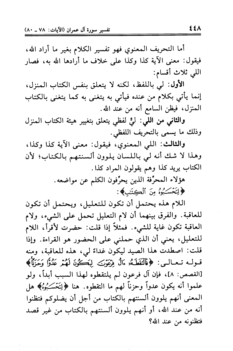 اللام هذه يحتمل أن تكون للتعليل، ويحتمل أن تكون للعاقبة. والفرق بينهما أن لام التعليل تحمل على الشيء، ولام العاقبة تكون غاية للشيء. فمثلًا إذا قلت: حضرت لأقرأ، اللام للتعليل، يعني أن الذي حملني على الحضور هو القراءة. وإذا قلت: اصطدت هذا الصيد ليكون غداءً لي، هذه للعاقبة، ومنه قوله تعالى: {فَالْتَقَطَهُ آلُ فِرْعَوْنَ لِيَكُونَ لَهُمْ عَدُوًّا وَحَزَنًا} [القصص: ٨]، فإن آل فرعون لم يلتقطوه لهذا السبب أبدًا، ولو علموا أنه يكون عدوًا وحزنًا لهم ما التقطوه. هنا {لِتَحْسَبُوهُ} هل المعنى أنهم يلوون ألسنتهم بالكتاب من أجل أن يضلوكم فتظنوا أنه من عند الله، أو أنهم يلوون ألسنتهم بالكتاب من غير قصد فتظنونه من عند الله؟