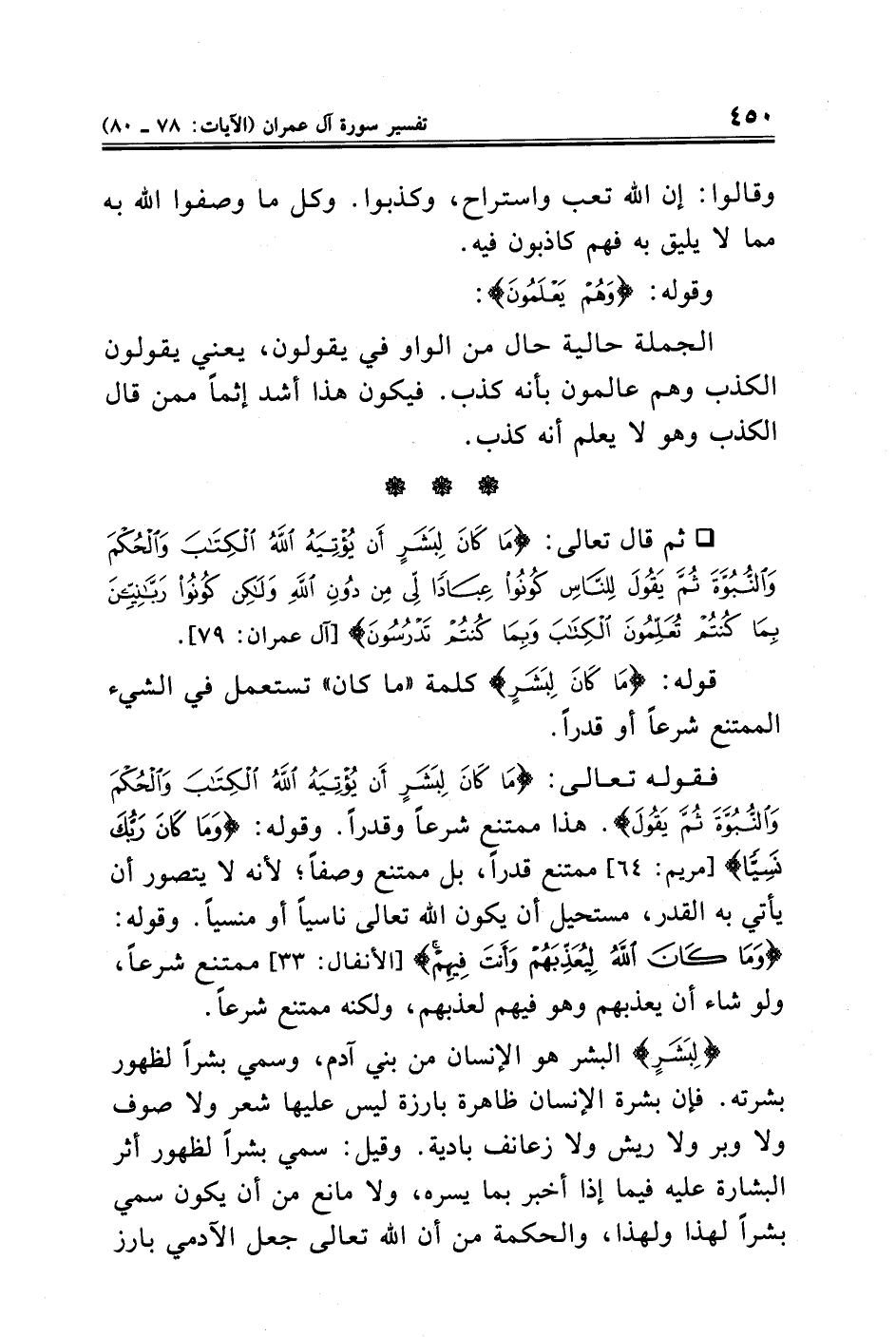 • ثم قال تعالى: {مَا كَانَ لِبَشَرٍ أَنْ يُؤْتِيَهُ اللَّهُ الْكِتَابَ وَالْحُكْمَ وَالنُّبُوَّةَ ثُمَّ يَقُولَ لِلنَّاسِ كُونُوا عِبَادًا لِي مِنْ دُونِ اللَّهِ وَلَكِنْ كُونُوا رَبَّانِيِّينَ بِمَا كُنْتُمْ تُعَلِّمُونَ الْكِتَابَ وَبِمَا كُنْتُمْ تَدْرُسُونَ} [آل عمران: ٧٩].