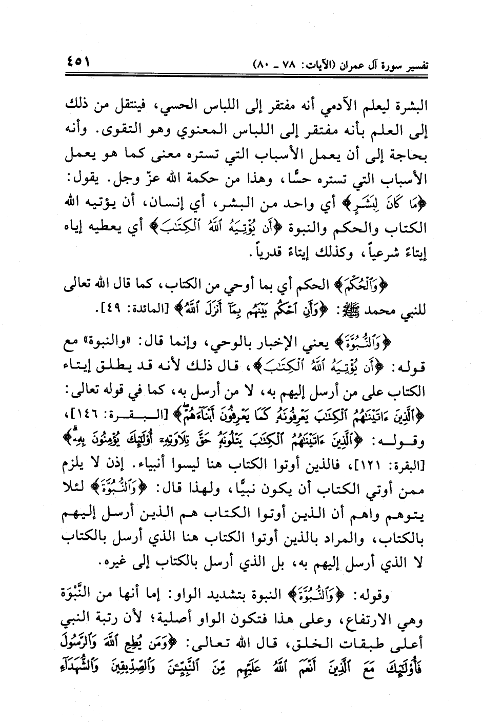 {وَالنُّبُوَّةَ} يعني الإخبار بالوحي، وإنما قال: "والنبوة" مع قوله: {أَنْ يُؤْتِيَهُ اللَّهُ الْكِتَابَ}، قال ذلك لأنه قد يطلق إيتاء الكتاب على من أرسل إليهم به، لا من أرسل به، كما في قوله تعالى: {الَّذِينَ آتَيْنَاهُمُ الْكِتَابَ يَعْرِفُونَهُ كَمَا يَعْرِفُونَ أَبْنَاءَهُمْ} [البقرة: ١٤٦]، وقوله: {الَّذِينَ آتَيْنَاهُمُ الْكِتَابَ يَتْلُونَهُ حَقَّ تِلَاوَتِهِ أُولَئِكَ يُؤْمِنُونَ بِهِ} [البقرة: ١٢١]، فالذين أوتوا الكتاب هنا ليسوا أنبياء. إذن لا يلزم ممن أوتي الكتاب أن يكون نبيًّا، ولهذا قال: {وَالنُّبُوَّةَ} لئلا يتوهم واهم أن الذين أوتوا الكتاب هم الذين أرسل إليهم بالكتاب، والمراد بالذين أوتوا الكتاب هنا الذي أرسل بالكتاب لا الذي أرسل إليهم به، بل الذي أرسل بالكتاب إلى غيره.